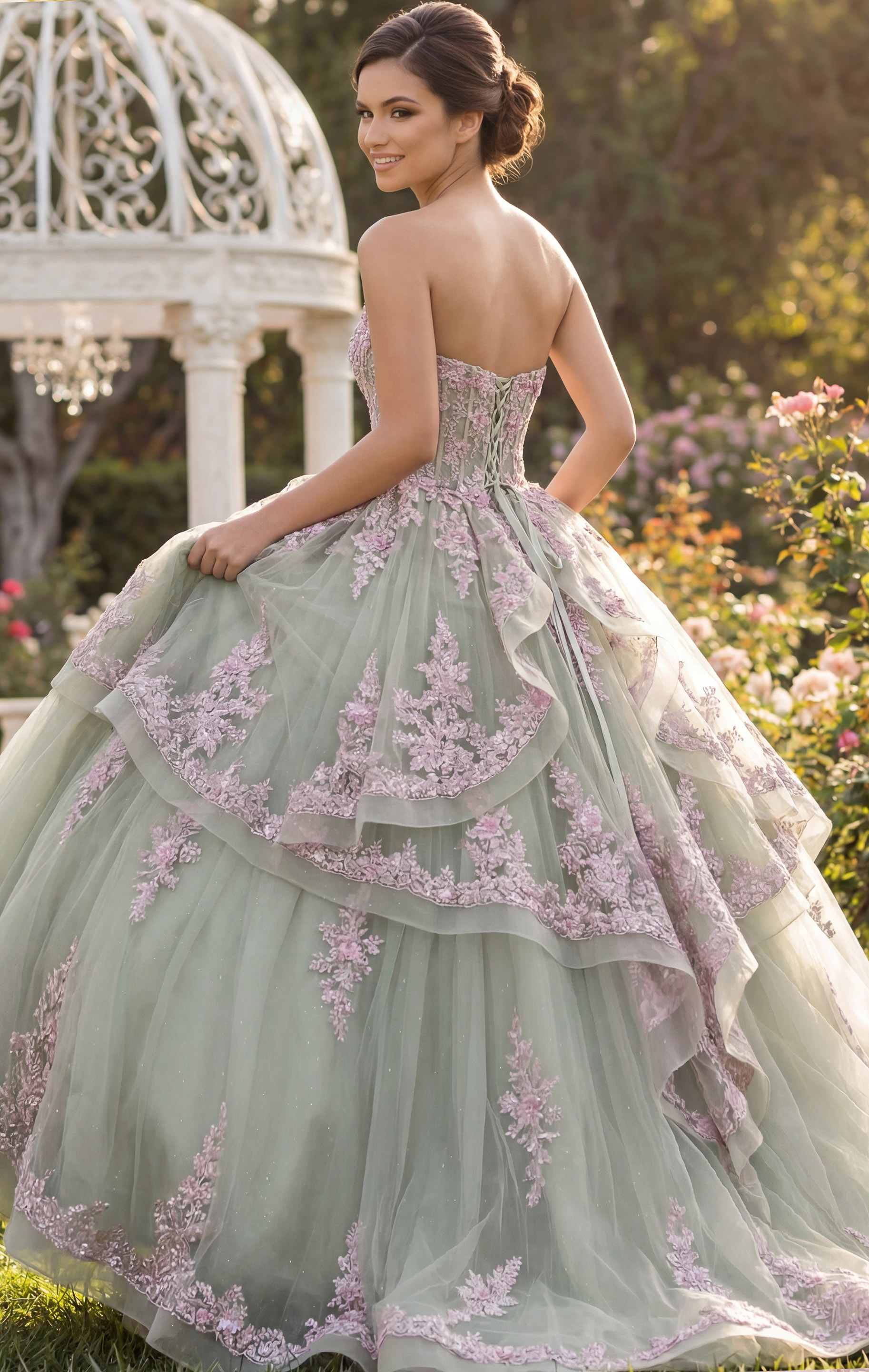 Layered Green Ball Gown with Pink Floral Appliqués Q45685