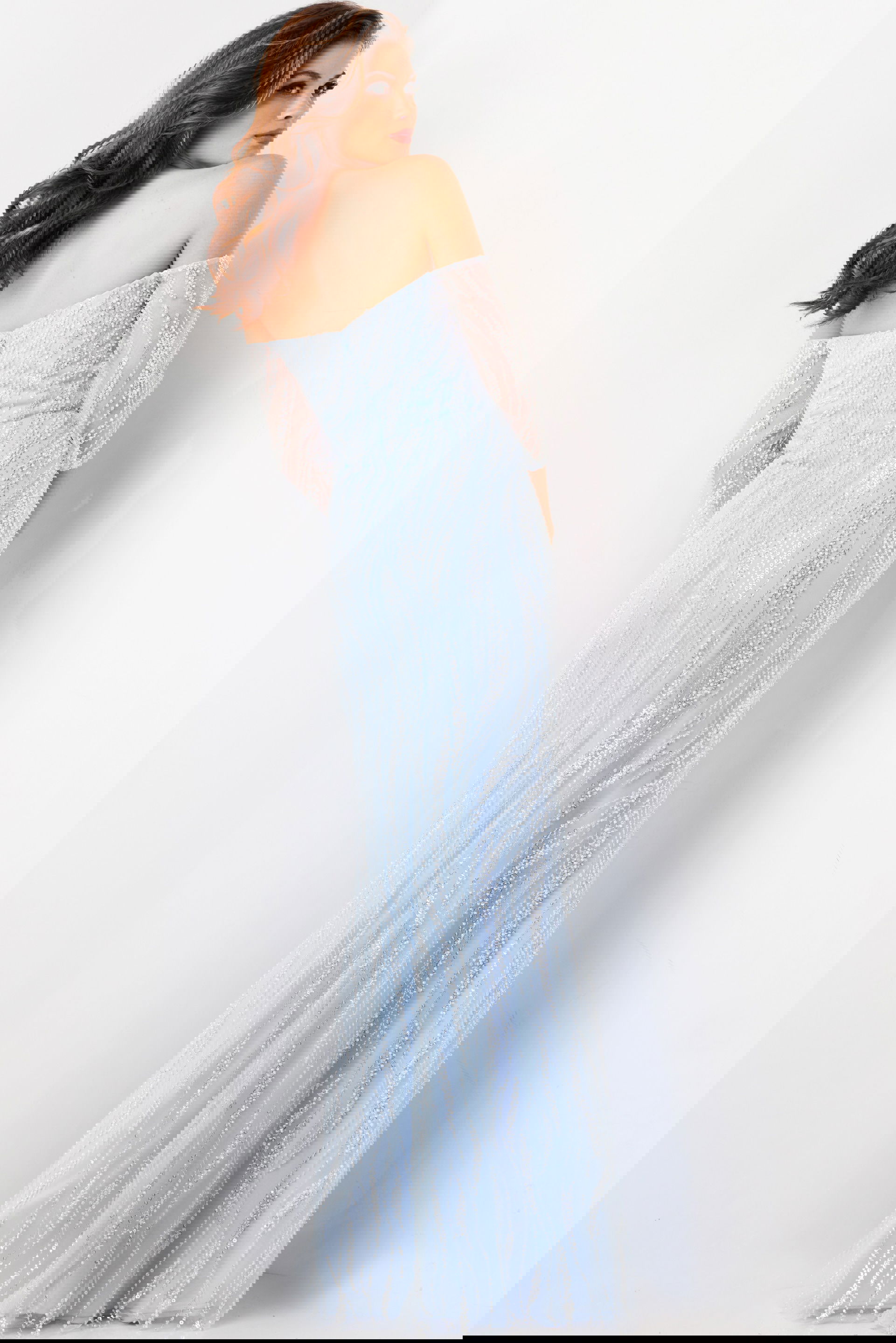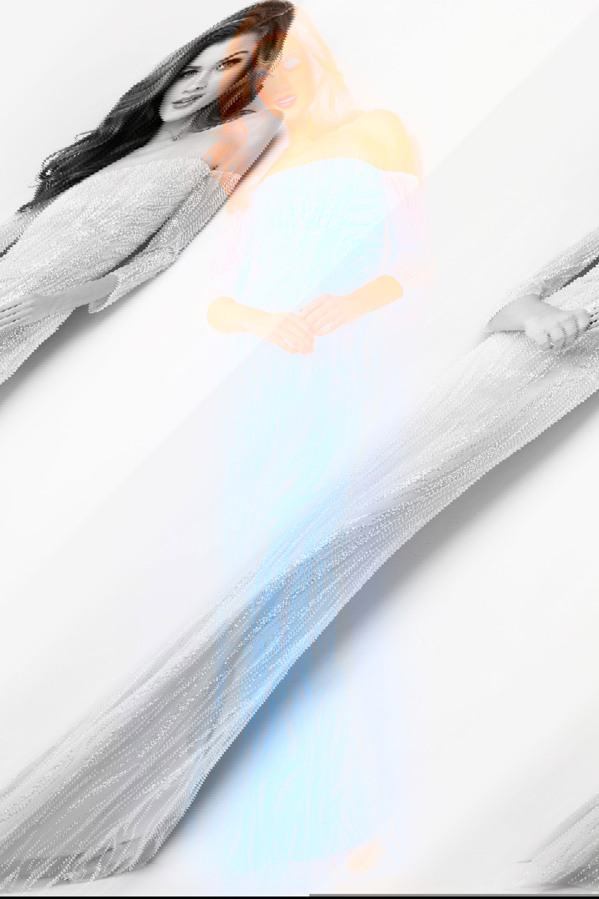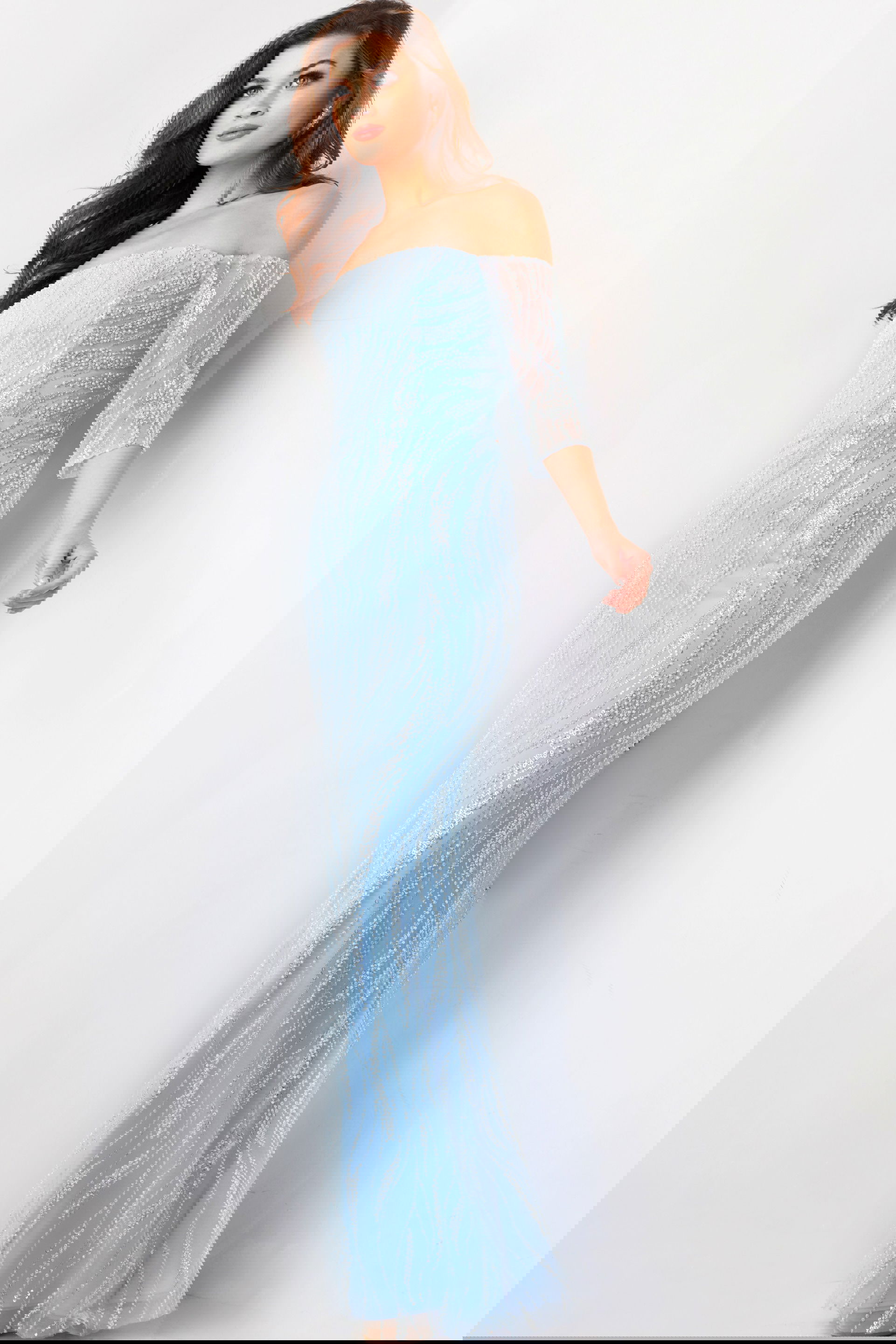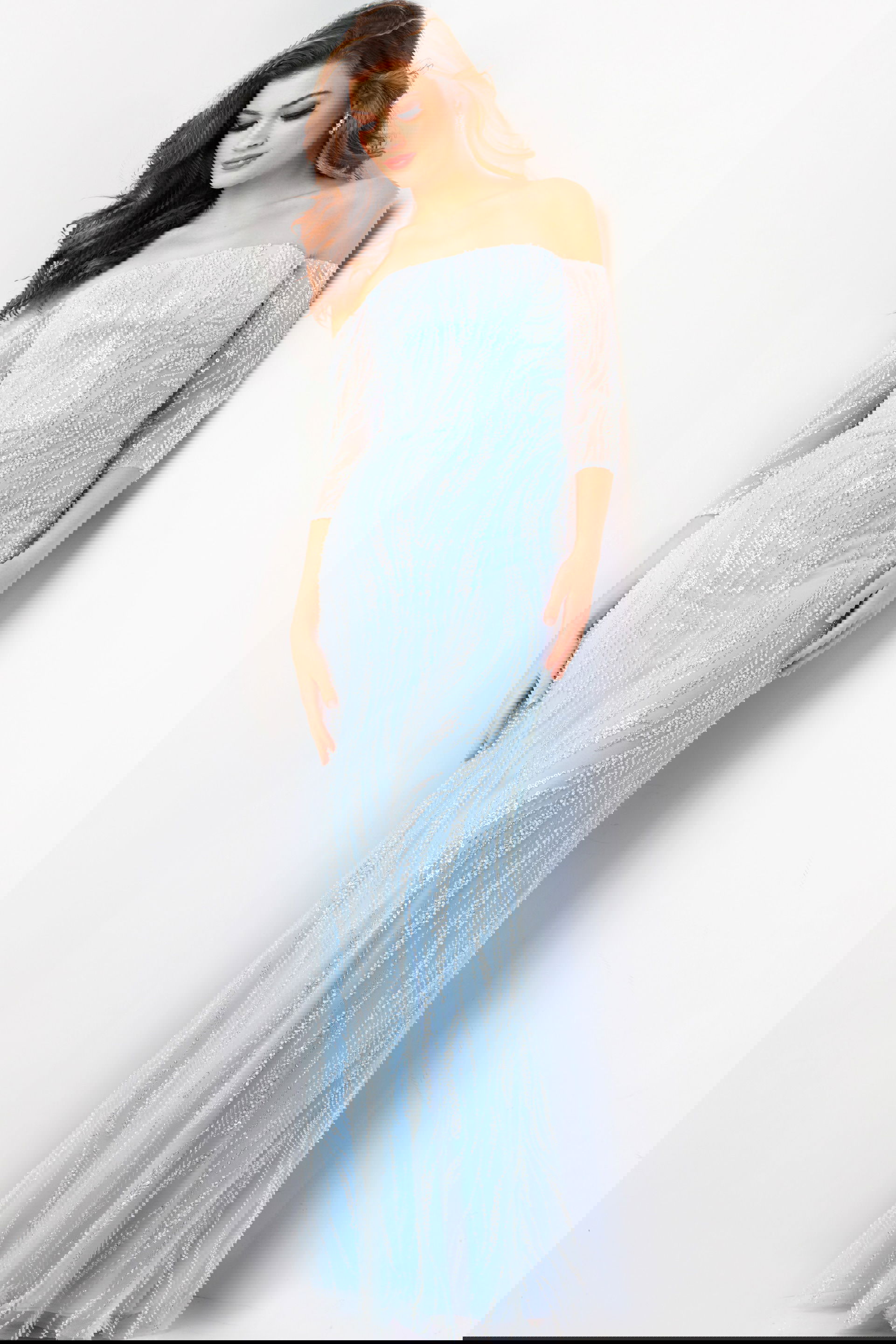 The three-quarter sleeves provide coverage and style, making this gown suitable for various weather conditions and personal preferences. Available in light blue and blush hues, this gown is perfect for adding a soft and romantic touch to any event.