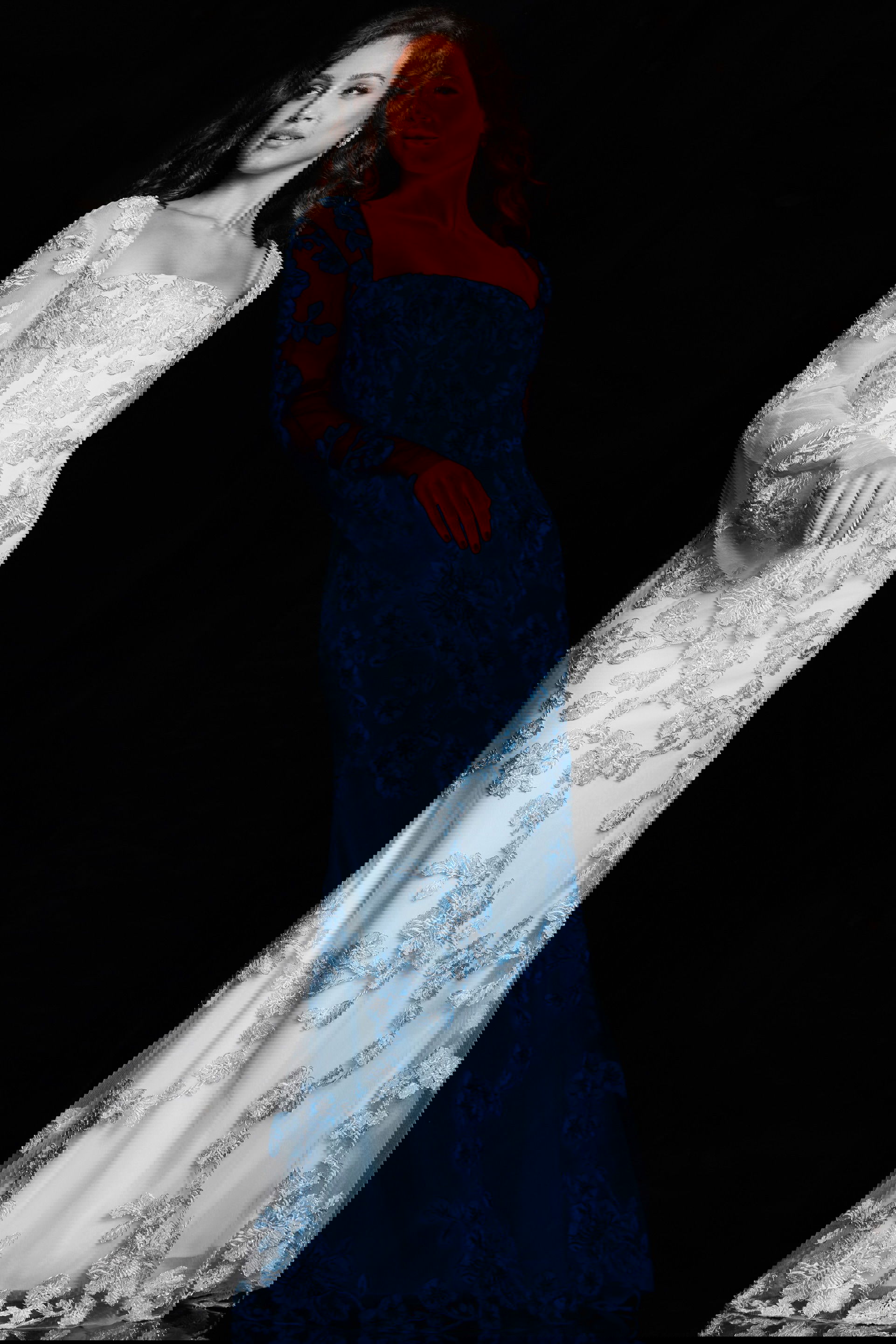 The square neckline adds a modern and elegant touch, enhancing the gown’s overall sophistication. The long bell sleeves add a dramatic and romantic flair, creating a captivating silhouette.