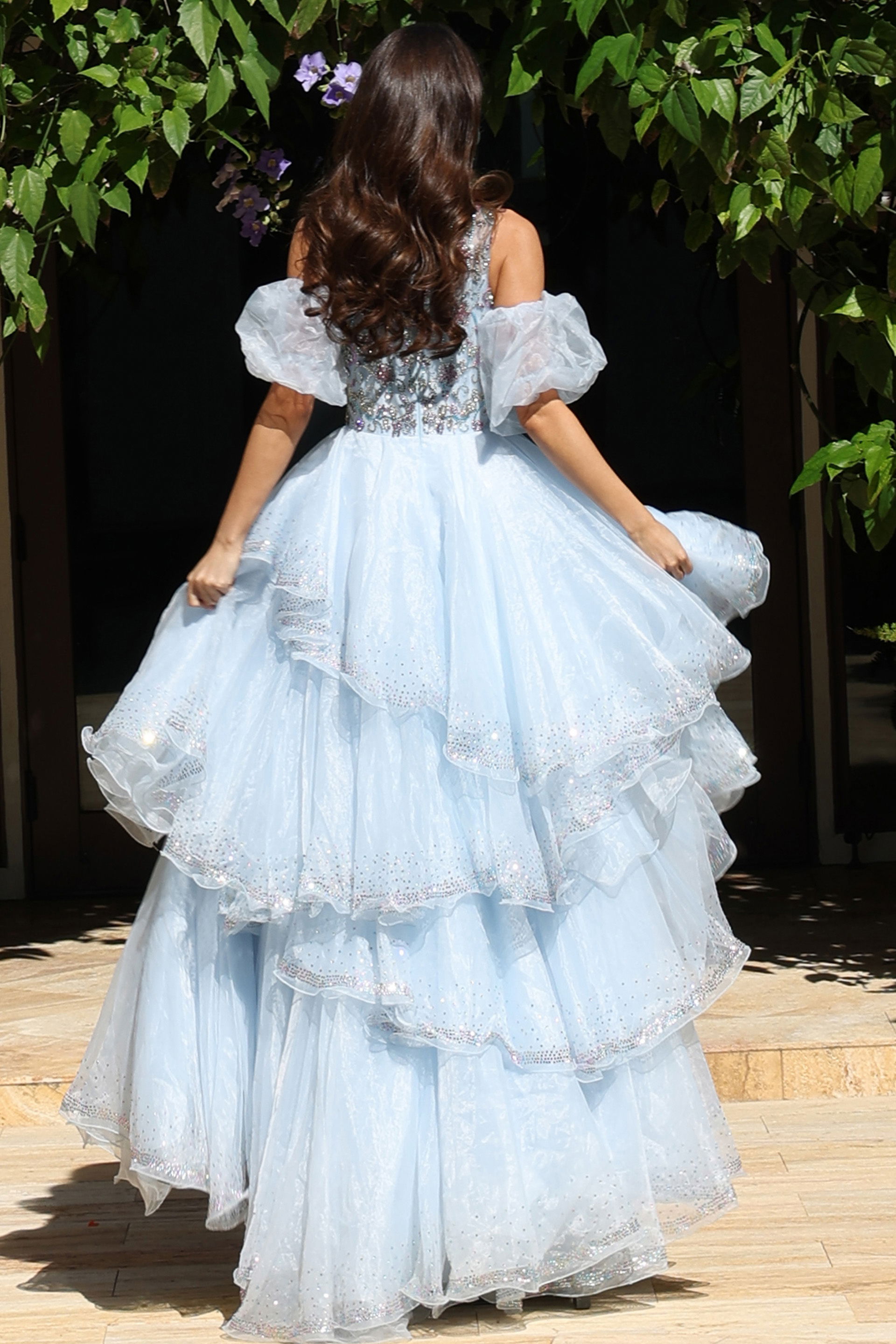 Light Blue Tiered Tulle Ball Gown With Beaded Bodice K42178