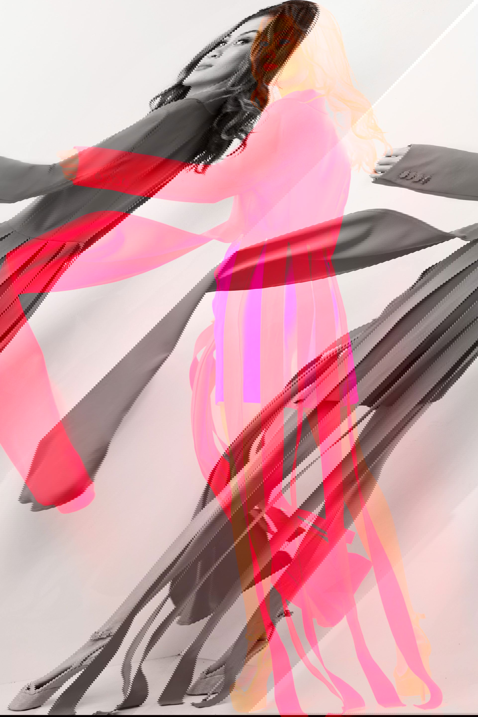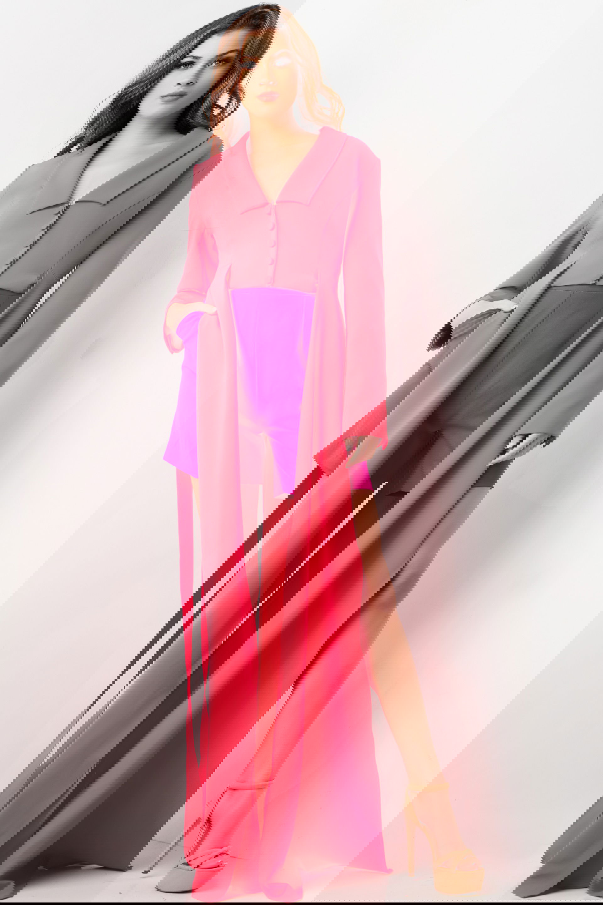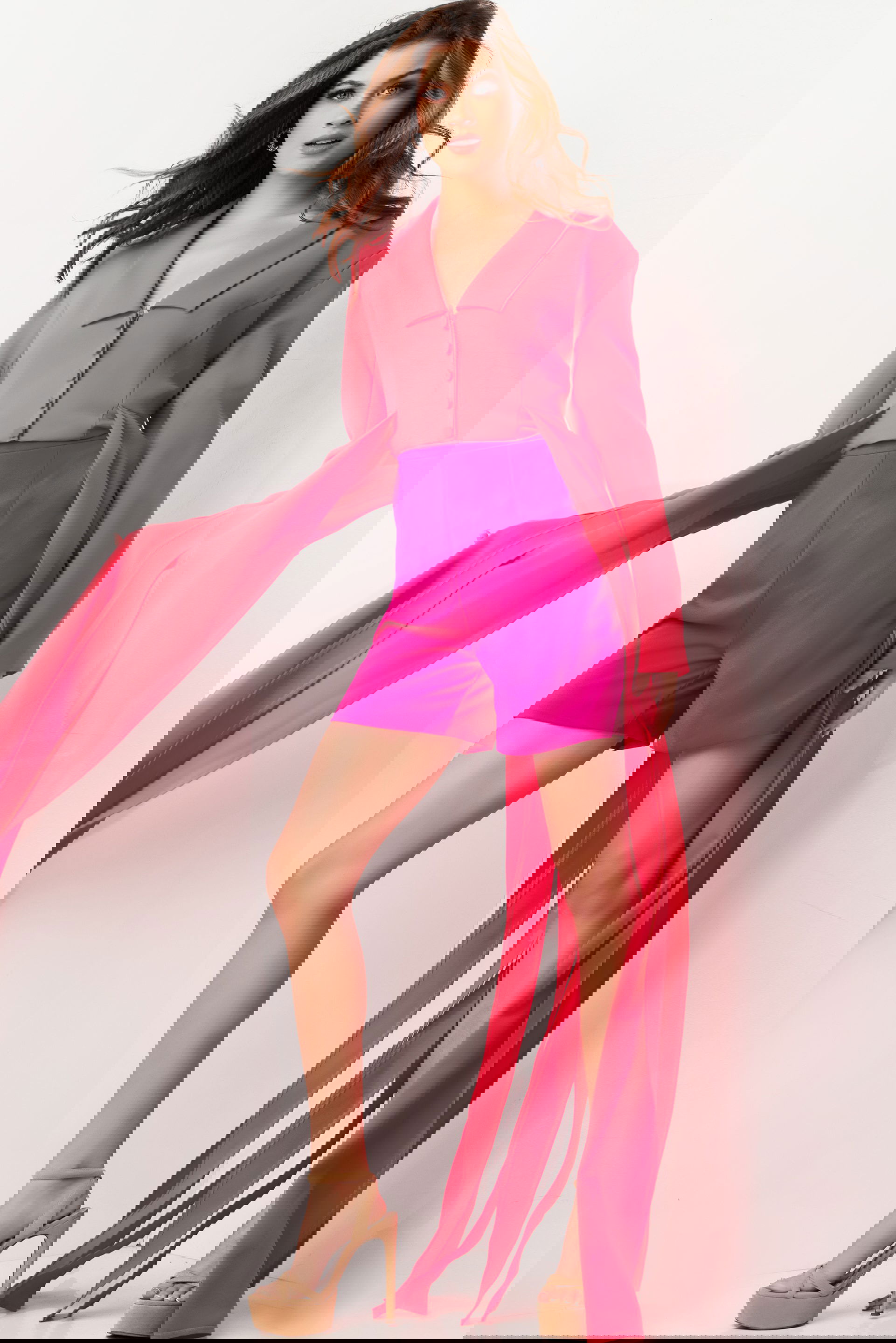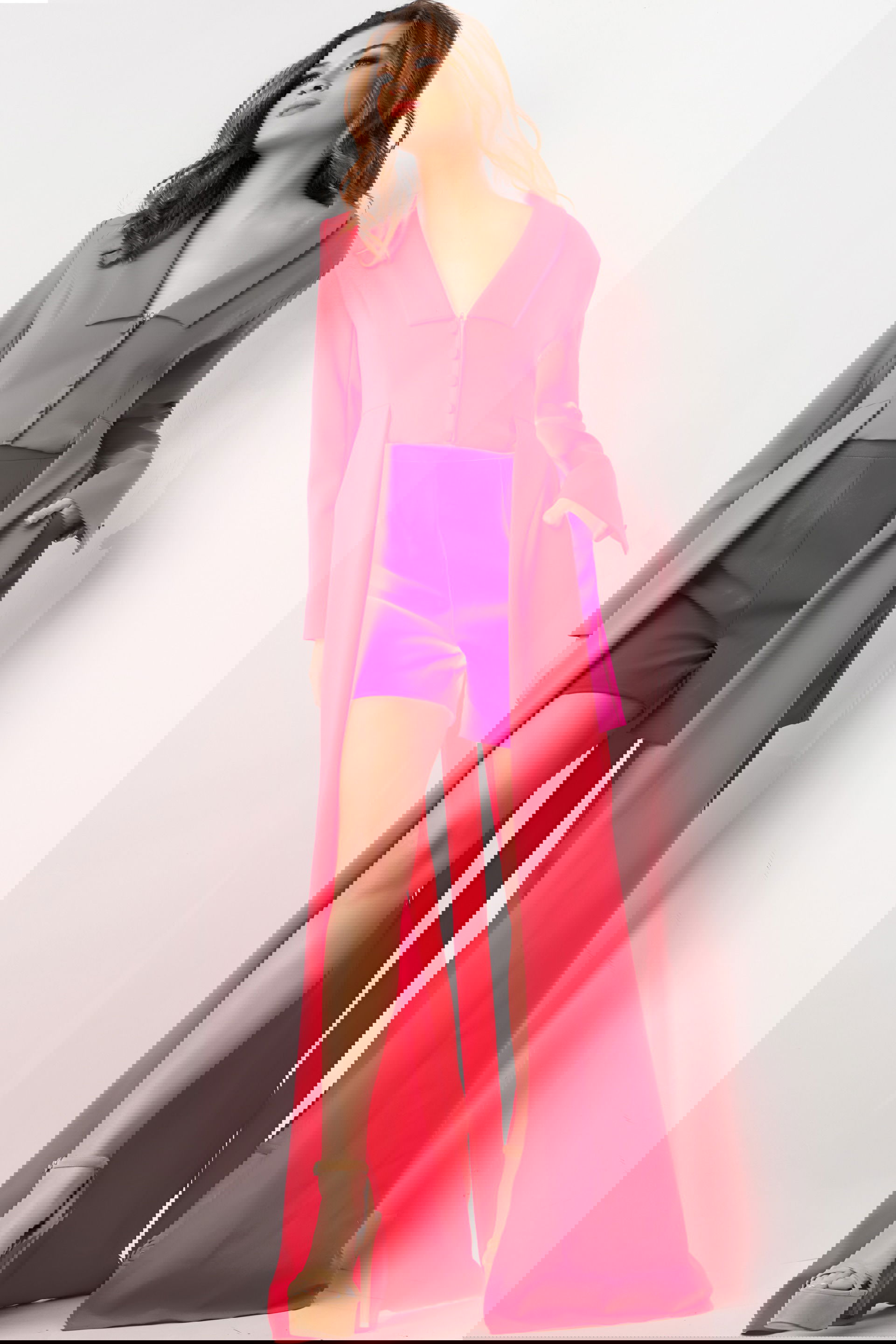 Lipstick Fuchsia Two Piece Contemporary Set 09127 is a daring and elegant outfit that combines modern style with vibrant colors. This unique set includes a chic V-neckline top adorned with buttons and dramatic long, flowing fabric details that give it an extra edge. The matching shorts, cut from high-quality satin fabric, provide a comfortable yet stylish fit that complements the top impeccably. Ideal for both day and evening wear, this ensemble blends contemporary fashion with a touch of glamour.