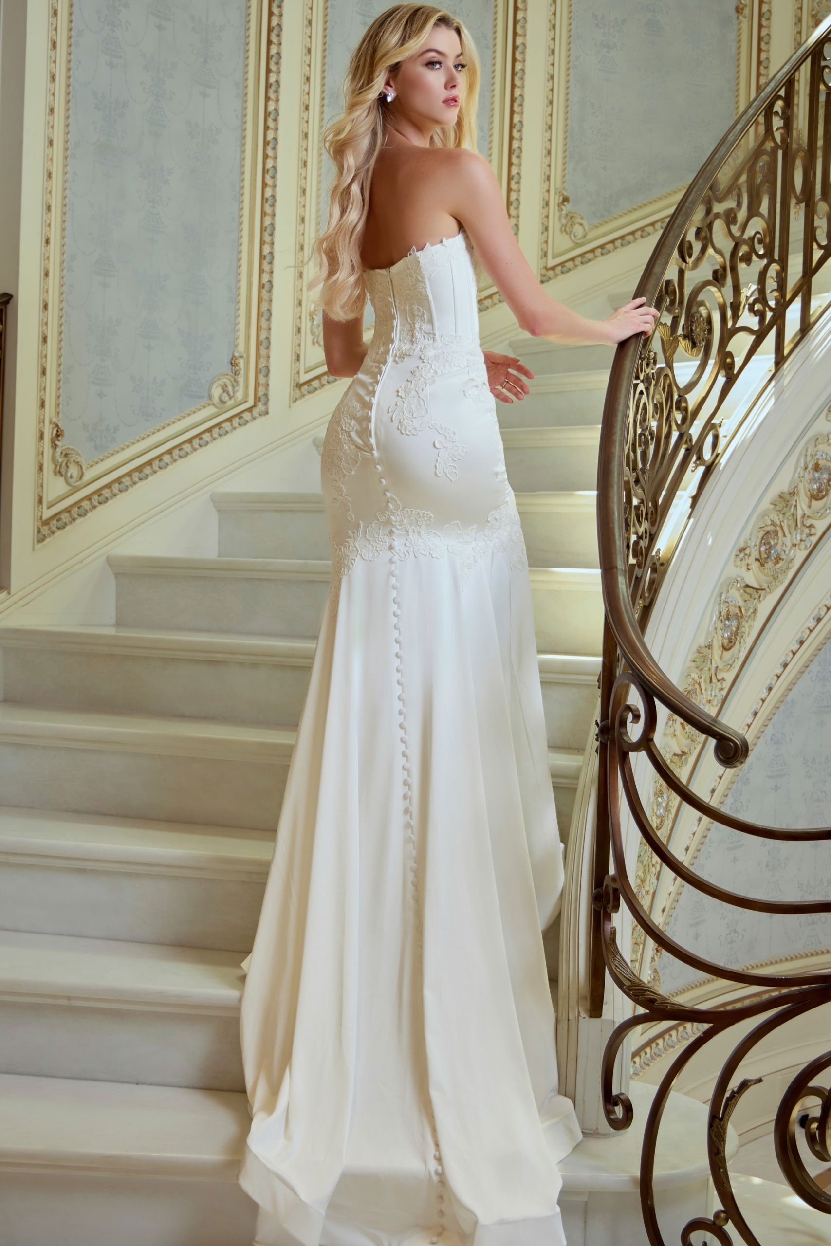 Sheer Corset Bodice, Lace Appliqués, Covered Button Back, Scalloped Lace Train