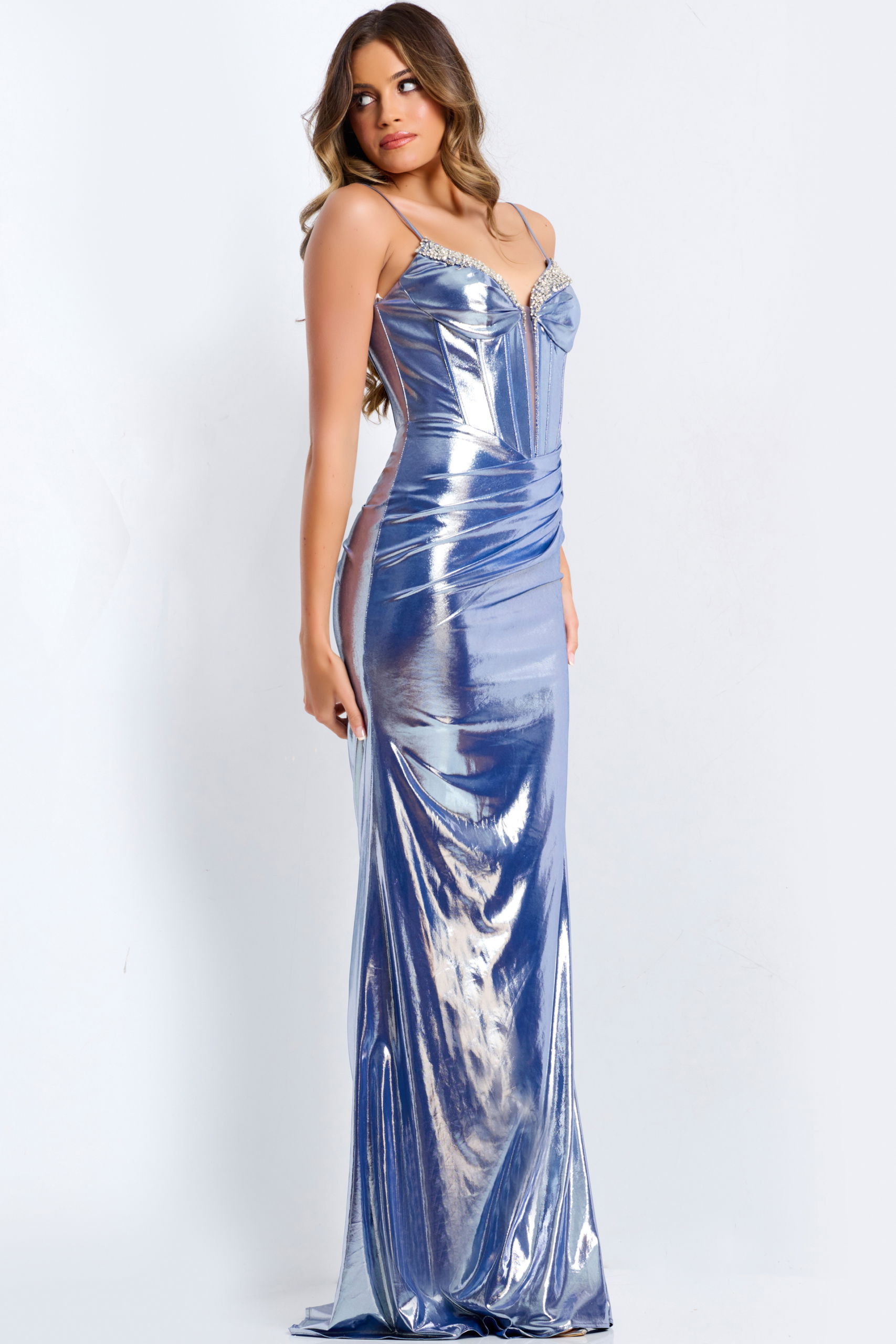 Metallic Prom Dress with Beaded Bust and Slit 45711