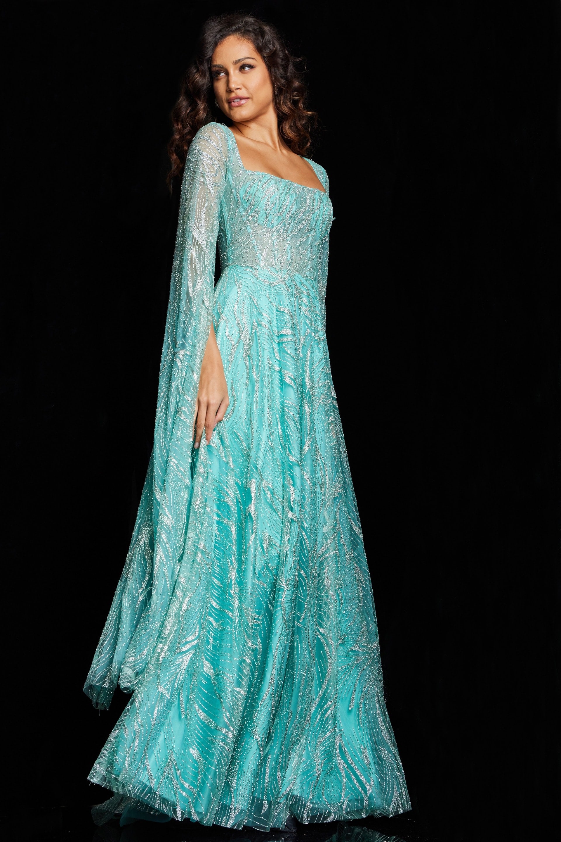 The square neckline adds a modern and elegant touch, enhancing the gown’s overall sophistication. The long sleeves, featuring splits, contribute to the gown’s chic and contemporary appeal.