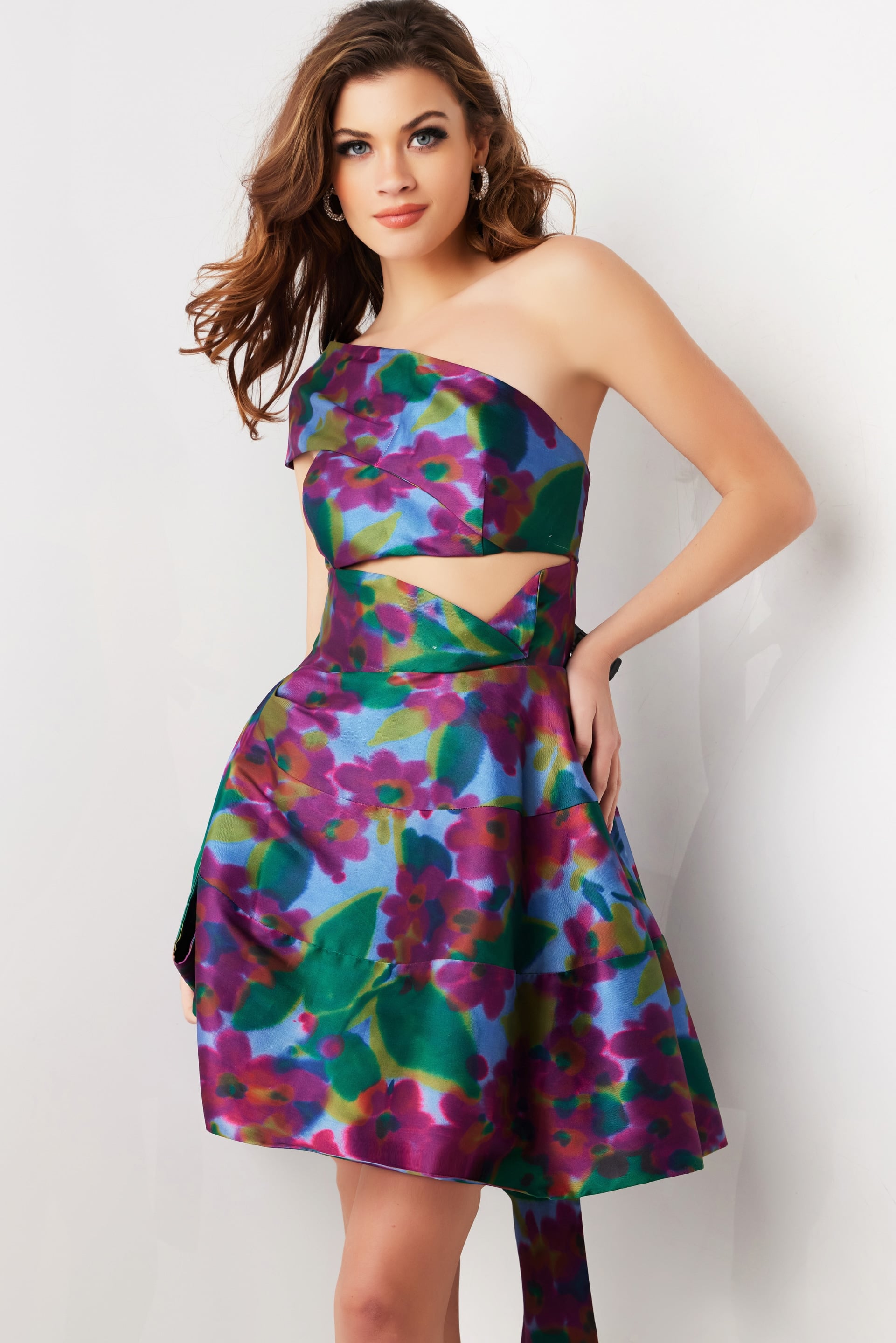 This vibrant one-shoulder dress features a stunning floral print in a mix of green, purple, and blue. Made from luxurious satin fabric, it boasts a trendy cut-out detail at the waist and a flattering A-line silhouette. The dress includes a unique closed back style, adding an elegant touch. Complete with a short hemline and sleeveless design, it is perfect for any stylish occasion. The intricate print and high-quality satin make this dress a standout piece for your wardrobe.