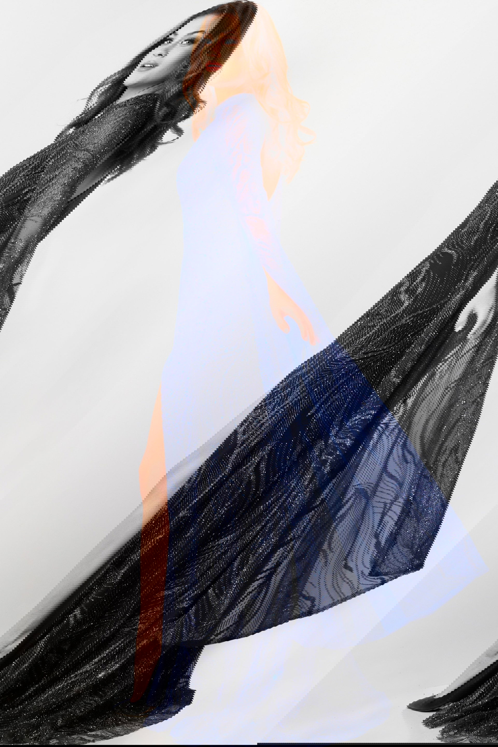 The fitted style of the dress accentuates the figure, while the glitter embellishments add a touch of sparkle and allure. Its high slit elongates the legs, adding a hint of allure to the ensemble, while the sweeping train enhances the gown’s regal presence.