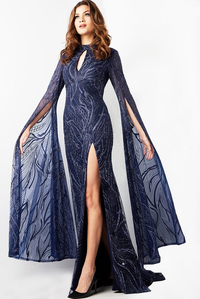 With a closed back style, the dress exudes sophistication and elegance from every angle. The high neckline with a keyhole detail adds a touch of allure, while the long cape sleeves provide drama and movement to the overall look.