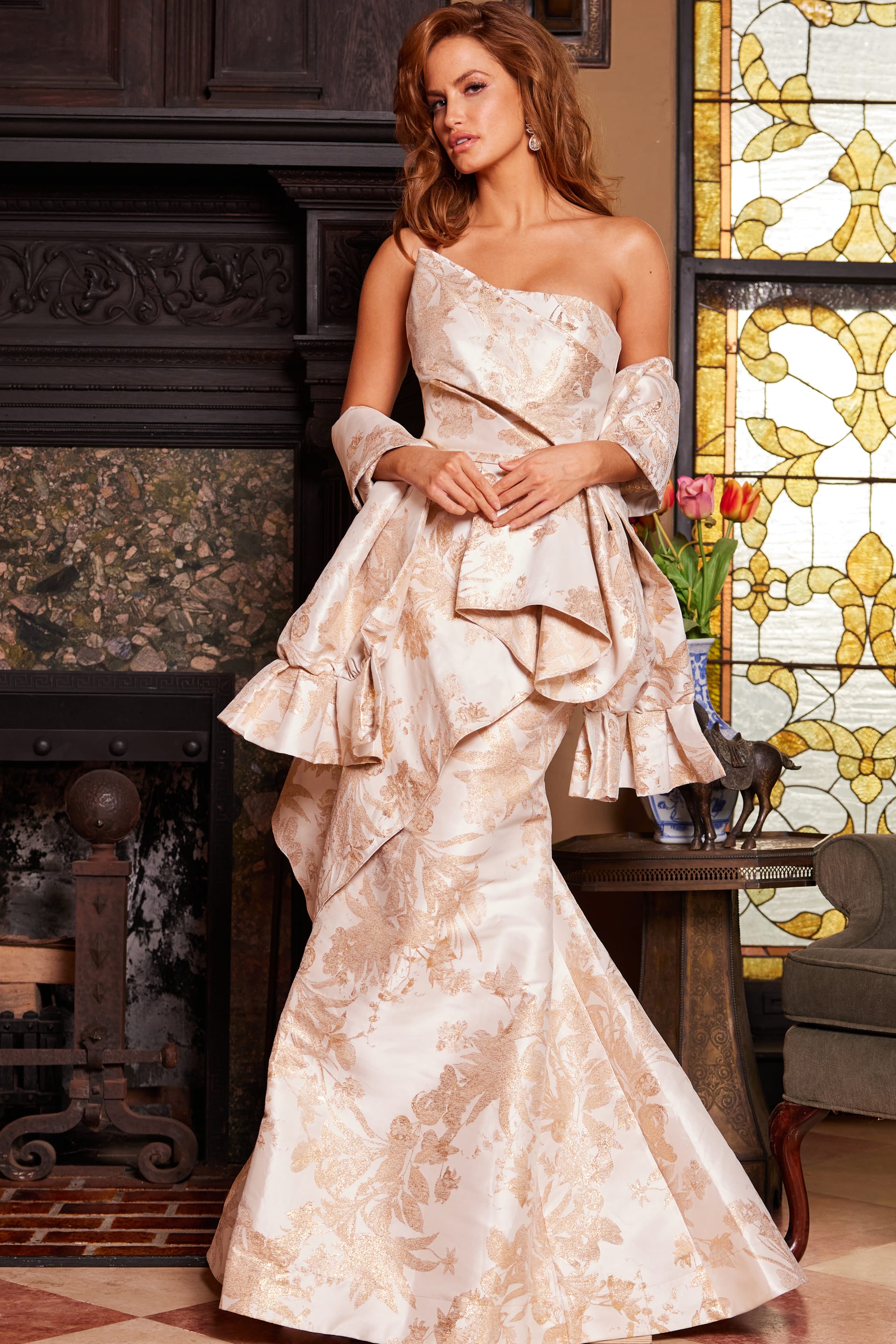 The gown, designed for Mother of the Bride and black-tie events, features a luxurious brocade material that adds texture and sophistication. The mermaid silhouette is tailored for a flattering fit, accentuating curves with a touch of grace. A pleated bodice and peplum detail provide intricate and contemporary elegance. With a long length, the gown exudes formality, suitable for special occasions. The straight back style and strapless neckline contribute to a clean and classic aesthetic, while the sleeveless design ensures a modern and chic appearance. Available in navy and gold, the gown is recommended for spot dry cleaning to maintain its pristine condition. Sizes range from 00 to 24, catering to a diverse range of body types for a timeless and elegant look