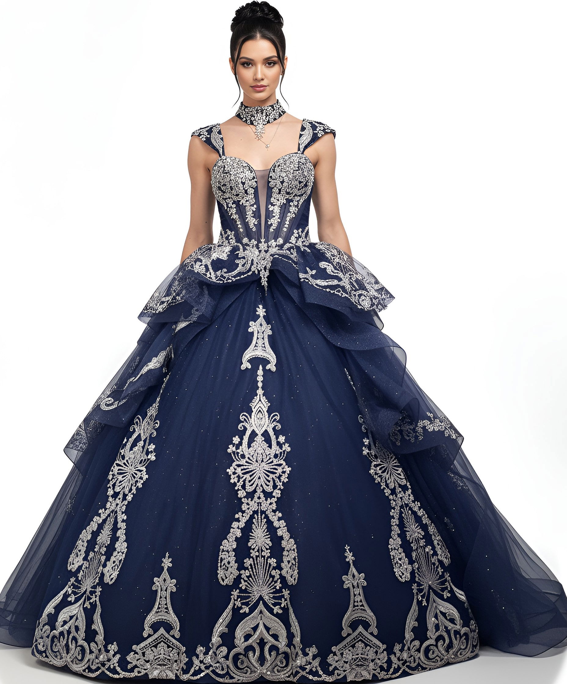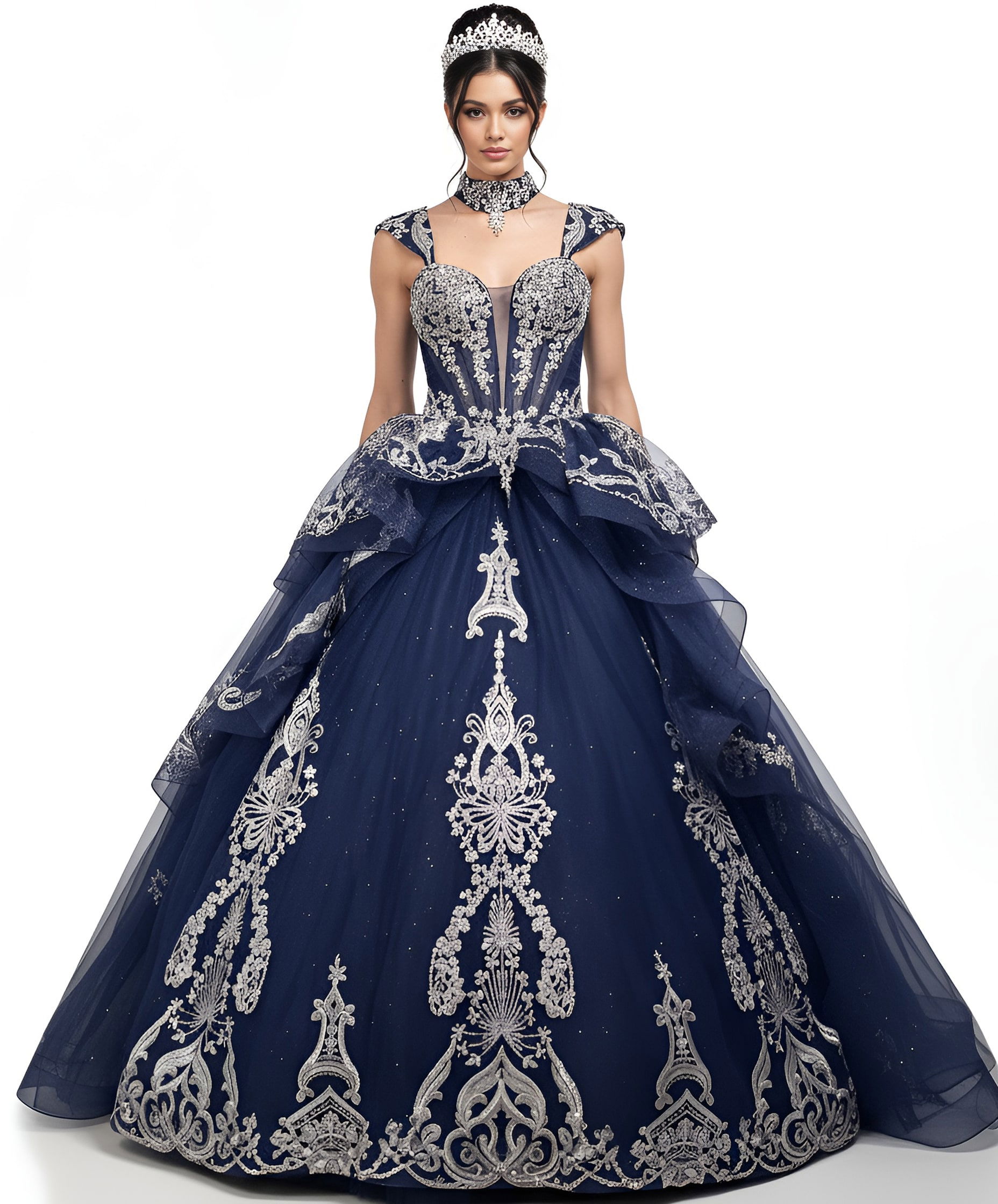 Navy Quinceañera Dress with Silver Embroidery Q48438