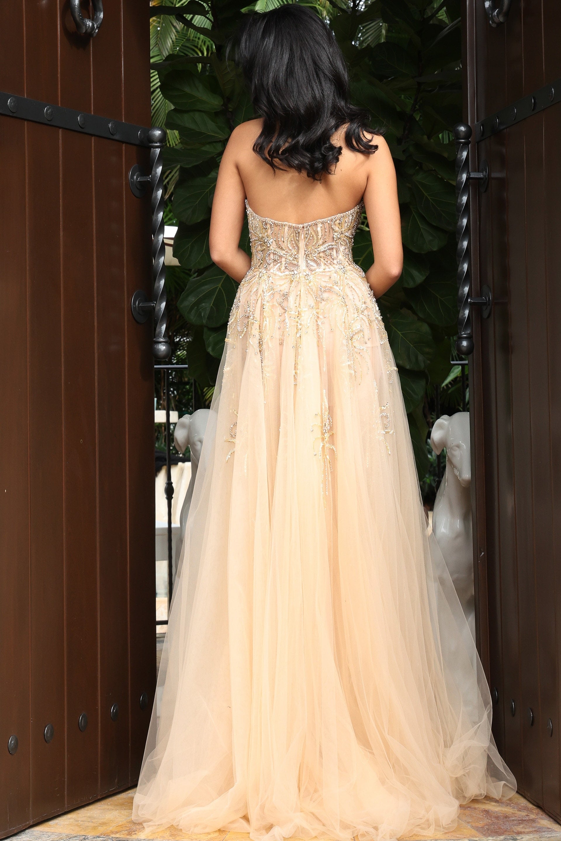Nude Gold Strapless Beaded Tulle Gown 46879