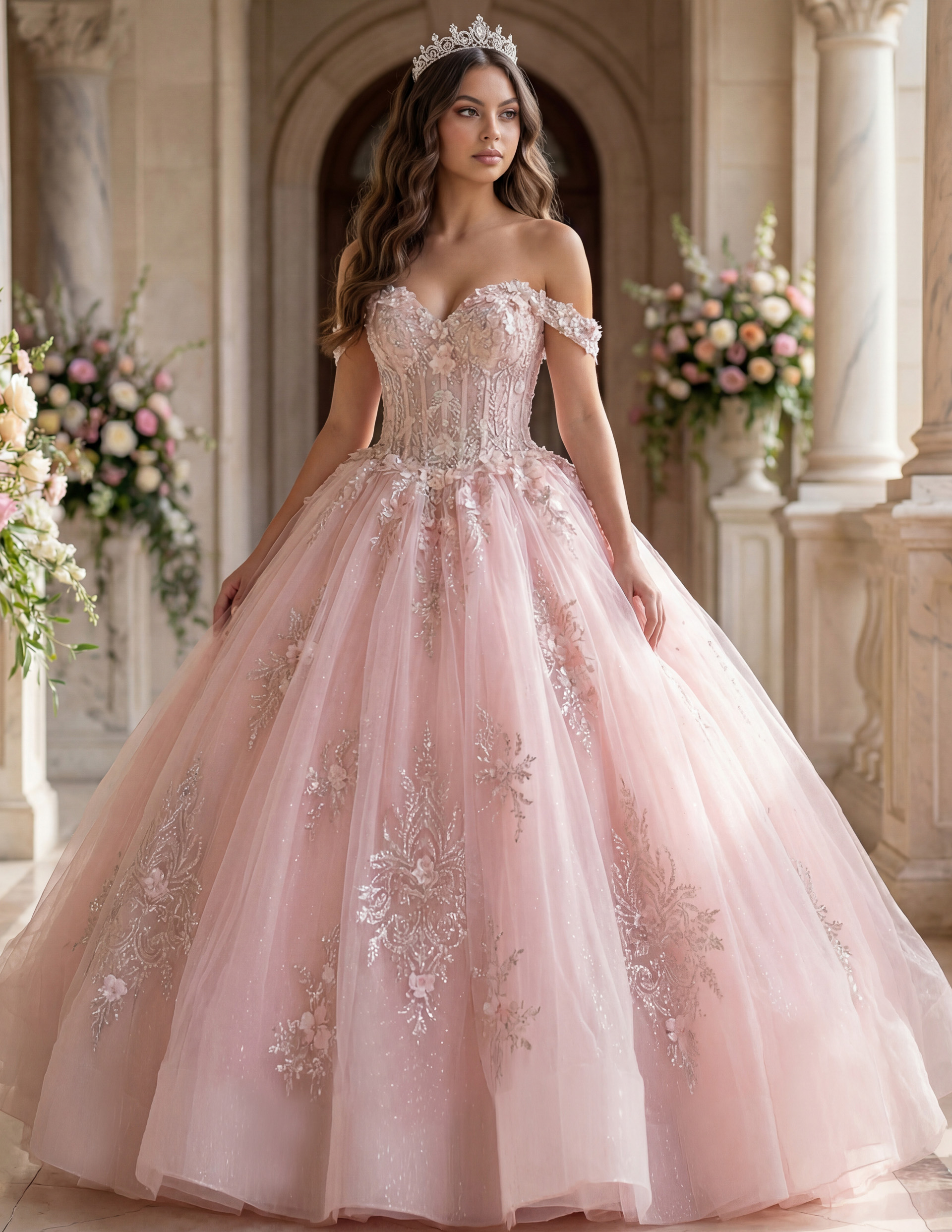 3D Floral Appliqués, Beading, Lace-Up Corset Bodice, Sparkle Tulle, Back Bow Detail