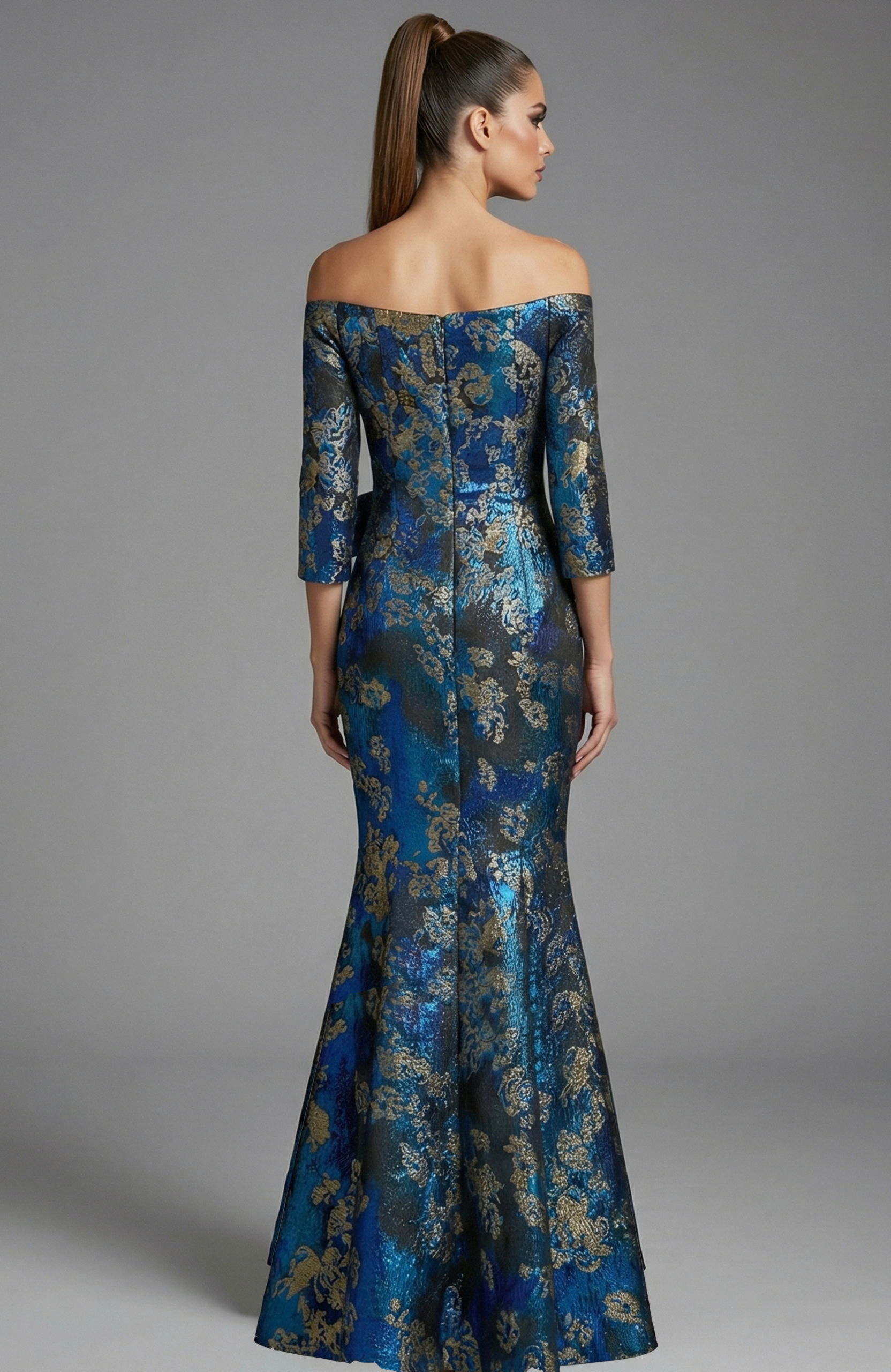 Off Shoulder Brocade Gown With Draped Waist Detail 49165