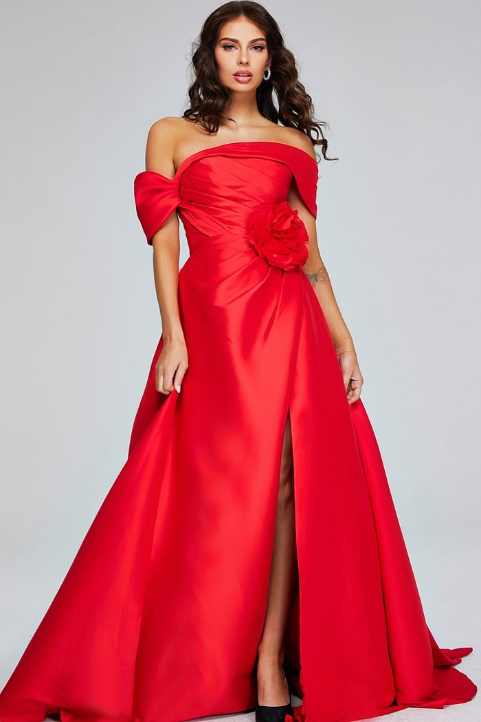 This glamorous ballgown features an elegant off-the-shoulder neckline and a flattering floor-length silhouette. Crafted from luxurious satin, the gown is adorned with a striking rosette detail at the waist and a chic high slit. Perfect for formal occasions, this eye-catching dress ensures you make a memorable entrance.