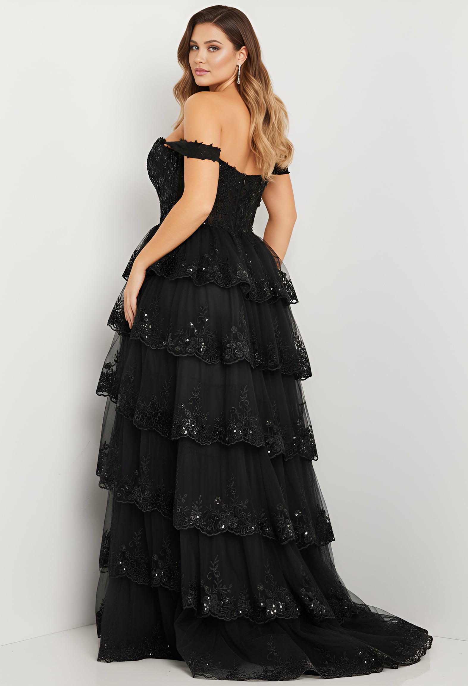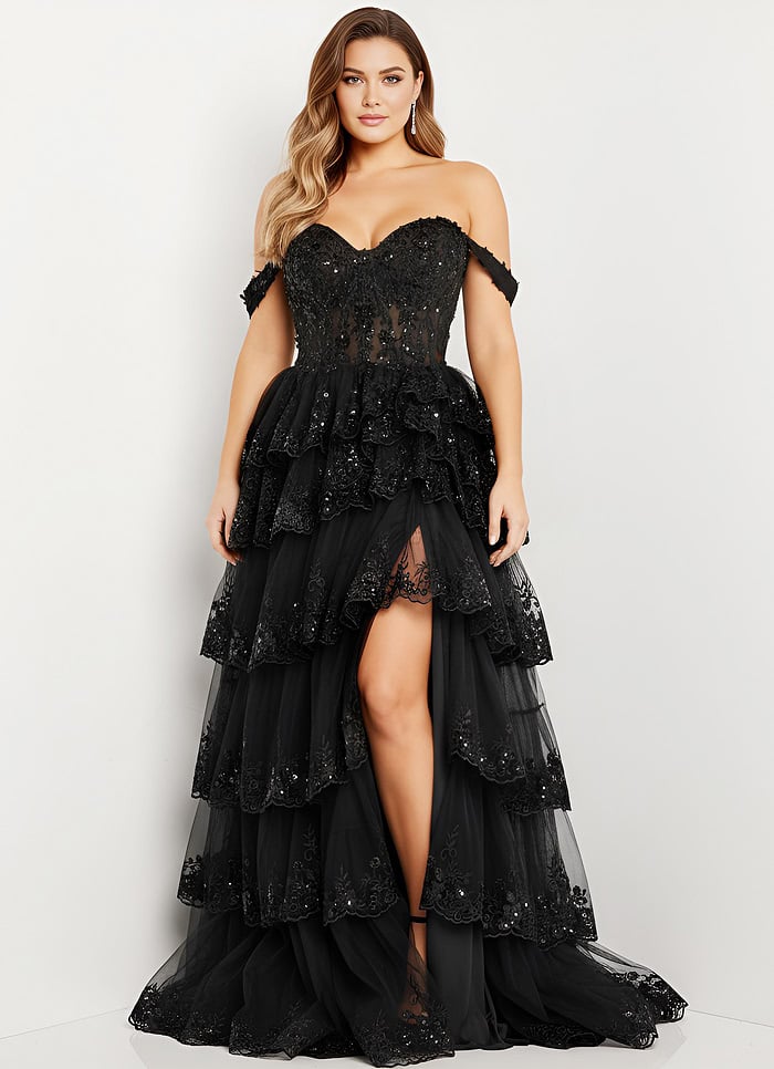 Off-Shoulder Tiered Ball Gown with Lace Details 36687