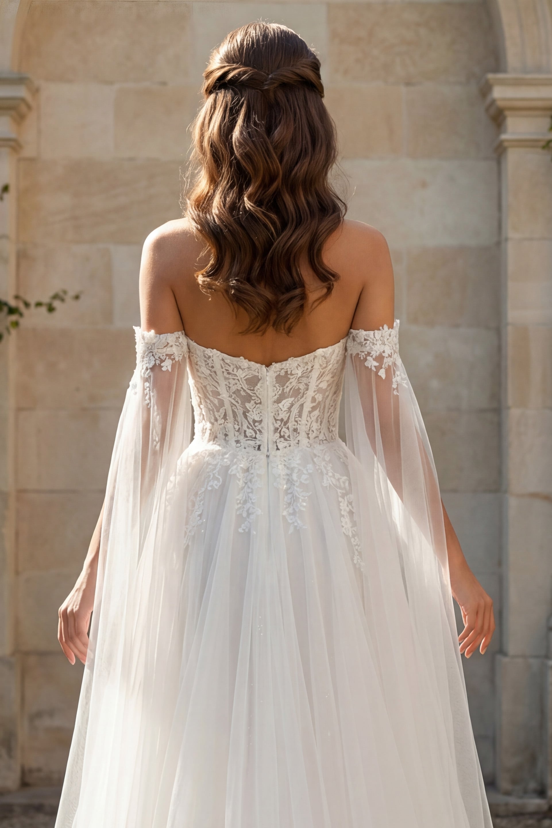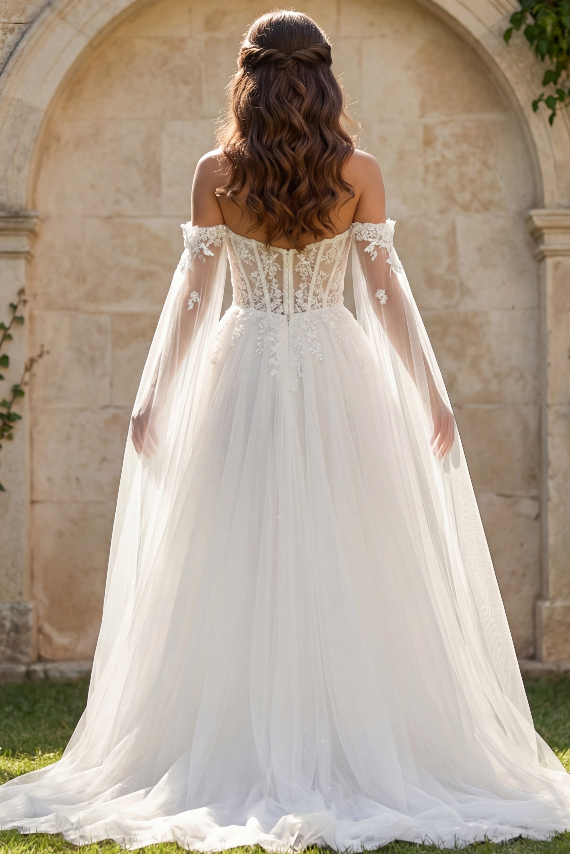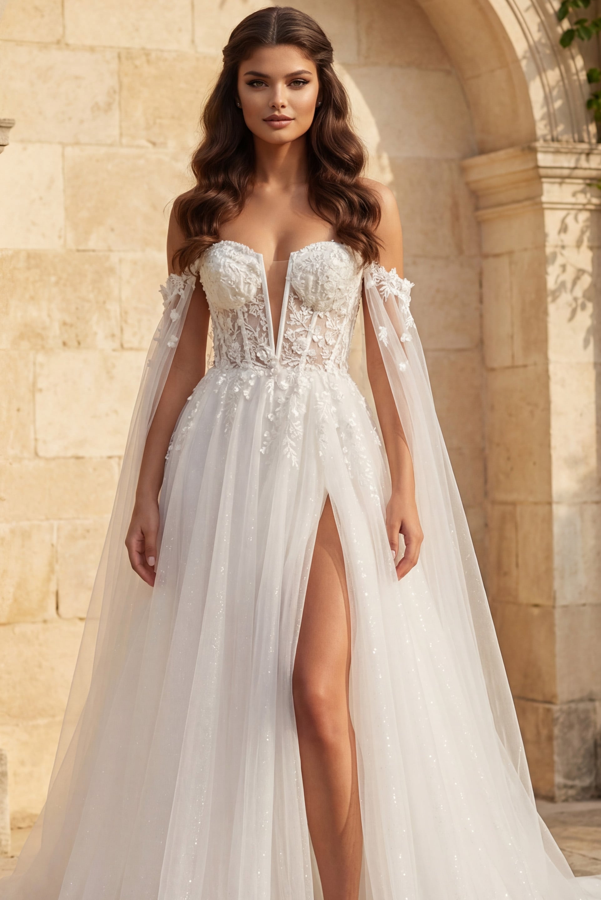 Off the Shoulder Sheer Bridal Gown with Floral Embellishments JB42480 is the epitome of ethereal beauty, designed to make every bride feel like a fairy-tale princess. This enchanting gown features an exquisite off-the-shoulder neckline, giving it a timelessly romantic feel. Detailed with delicate floral appliqués and beading, the sheer fabric adds a touch of whimsy while maintaining a sophisticated allure. The high slit in the long, flowing tulle skirt creates a captivating and modern silhouette, ensuring ease of movement on your special day. Perfect for the bride who desires a blend of classic elegance and contemporary style, this gown promises to leave a lasting impression.
