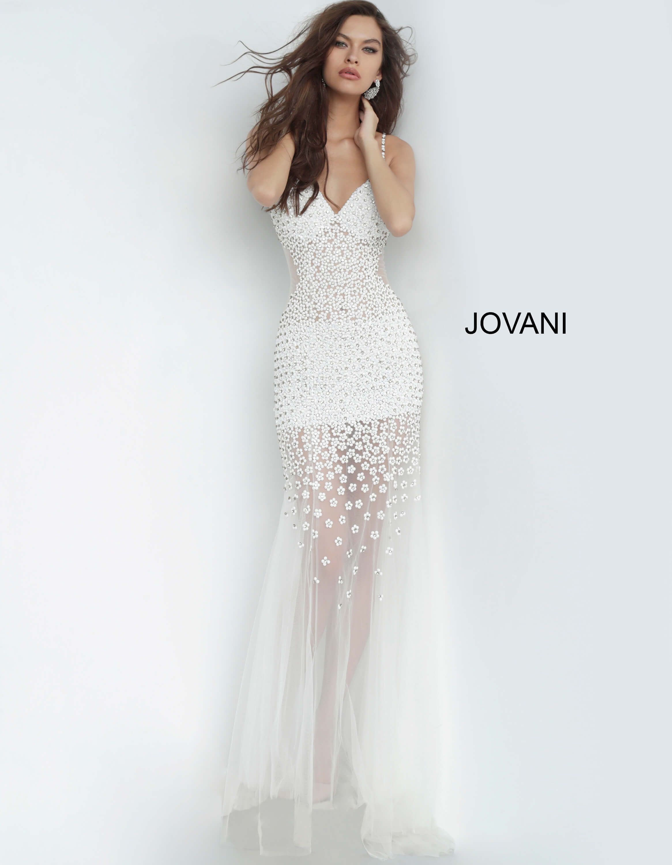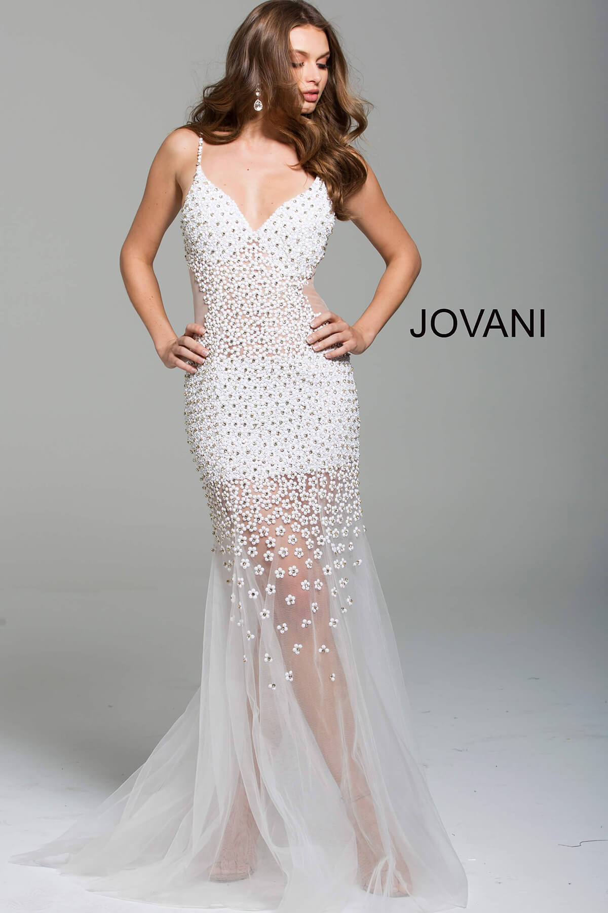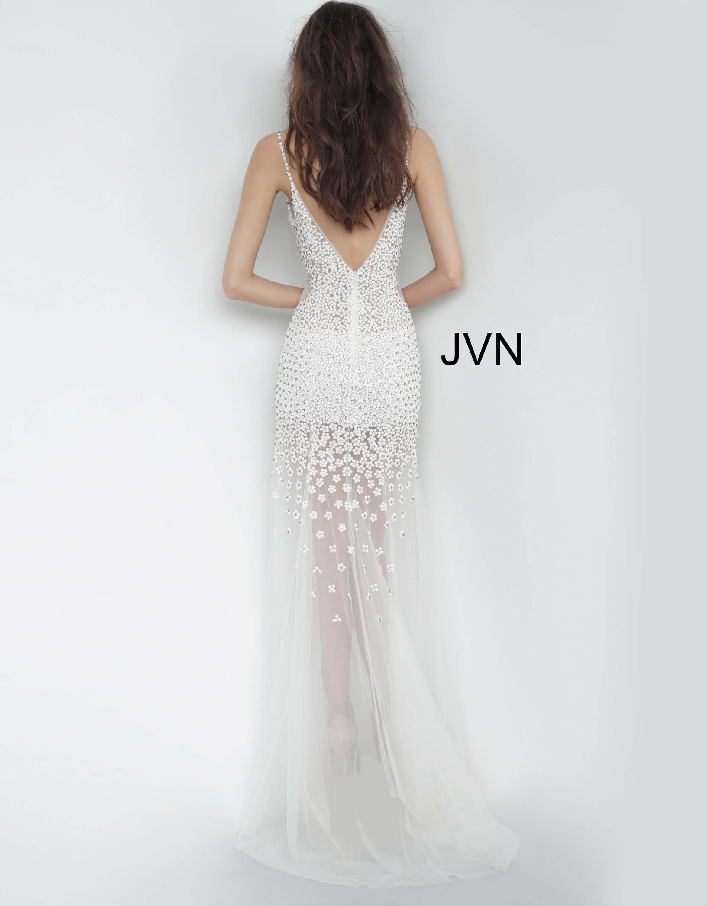 Off White Beaded Dress 60695 is a breathtaking long dress that exudes elegance and sophistication. With its exquisite beadwork, the dress is a dazzling choice for any formal occasion. The dress features an alluring open V back style and a sexy sheath silhouette that contours the body beautifully. Crafted from luxurious sheer fabric, it combines delicate details such as a high slit and floor-length cut for a captivating look. The V-neckline and sleeveless design add a touch of modern charm, making this dress a perfect blend of glamour and chic.