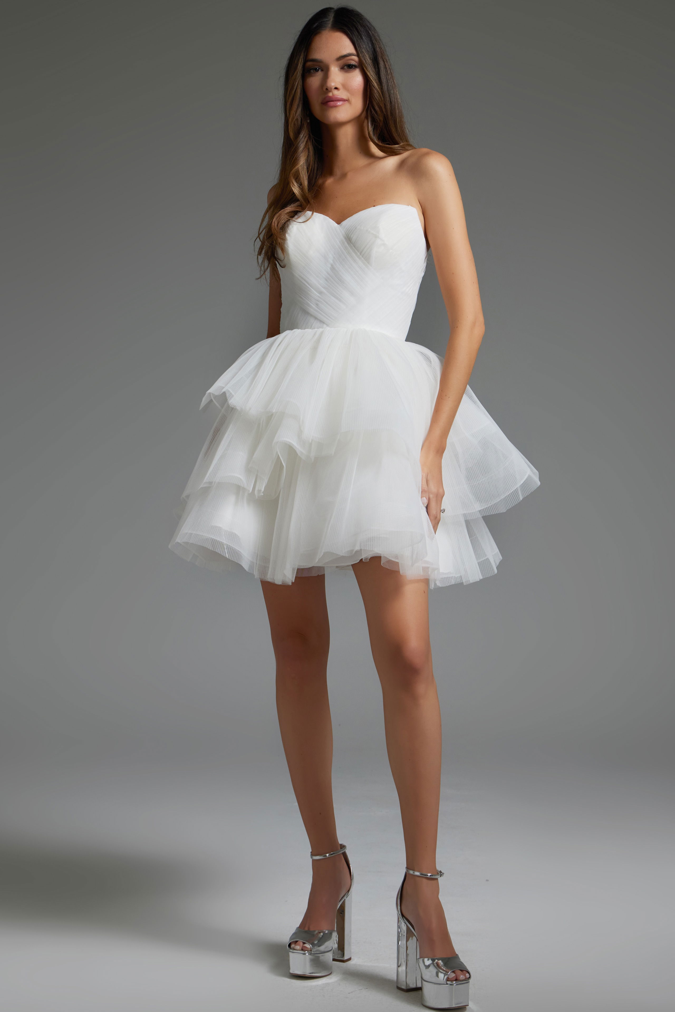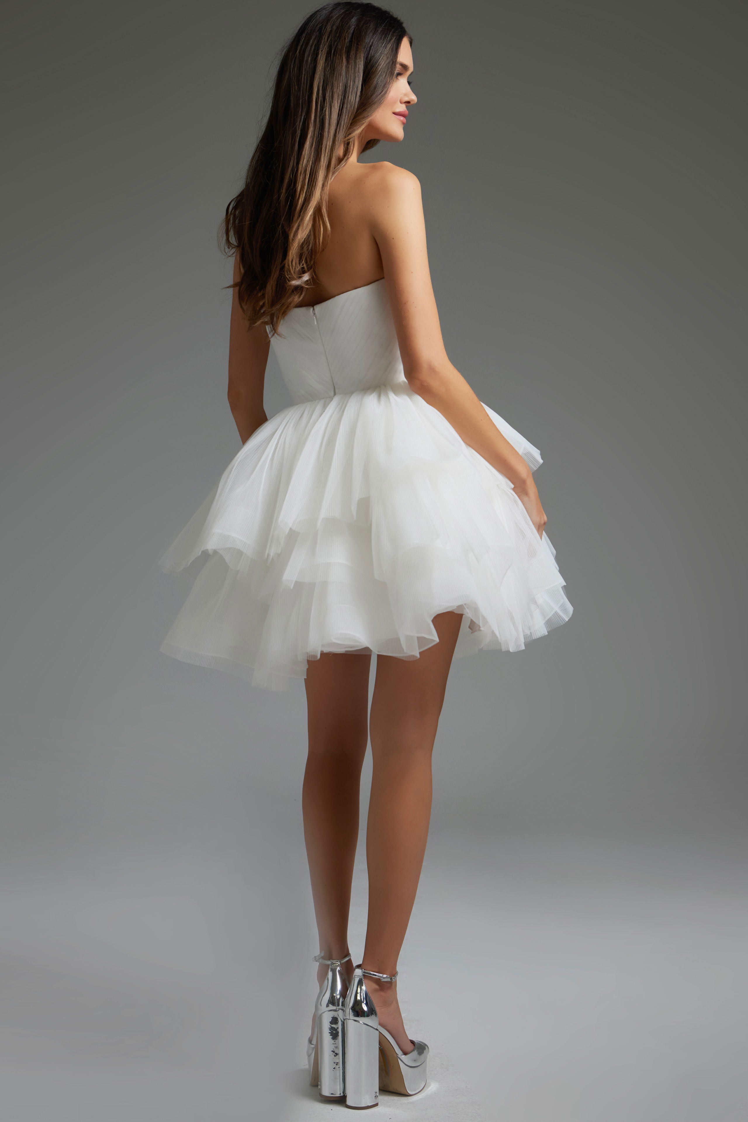 This stunning strapless dress features a sweetheart neckline and is crafted from soft and airy tulle. The tiered design adds a touch of playful elegance, while the short length makes it perfect for semi-formal occasions. The dress is in a beautiful off-white color, giving it a timeless and classic look.