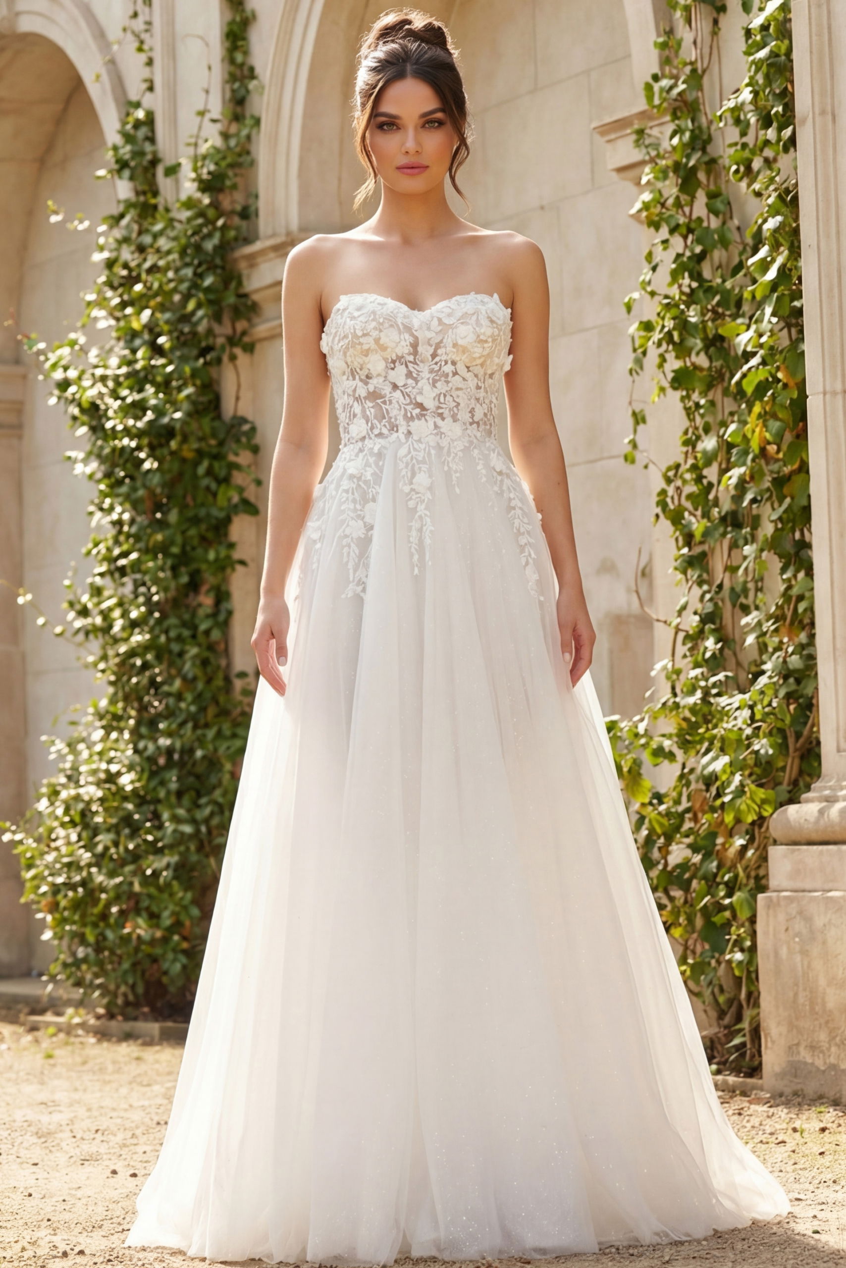 This enchanting strapless wedding gown features an A-line silhouette crafted from delicate tulle. The bodice is intricately beaded with floral appliques and a sweetheart neckline that offers a romantic touch. The floor-length skirt flows gracefully, making it perfect for any bride looking for a timeless and elegant look.
