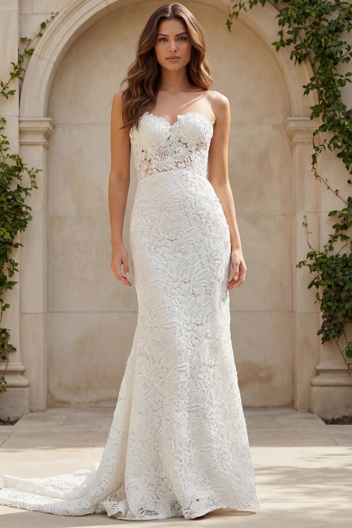 Embrace luxurious elegance with this exquisite strapless mermaid gown. Crafted from delicate lace fabric, it features intricate beading details that add a touch of sparkle. The floor-length silhouette gracefully hugs the body through the bodice and hips, flaring beautifully at the knee, epitomizing the classic mermaid silhouette. The gown comes with a sweetheart neckline and is sleeveless, ensuring a timeless and romantic appearance for any special occasion.