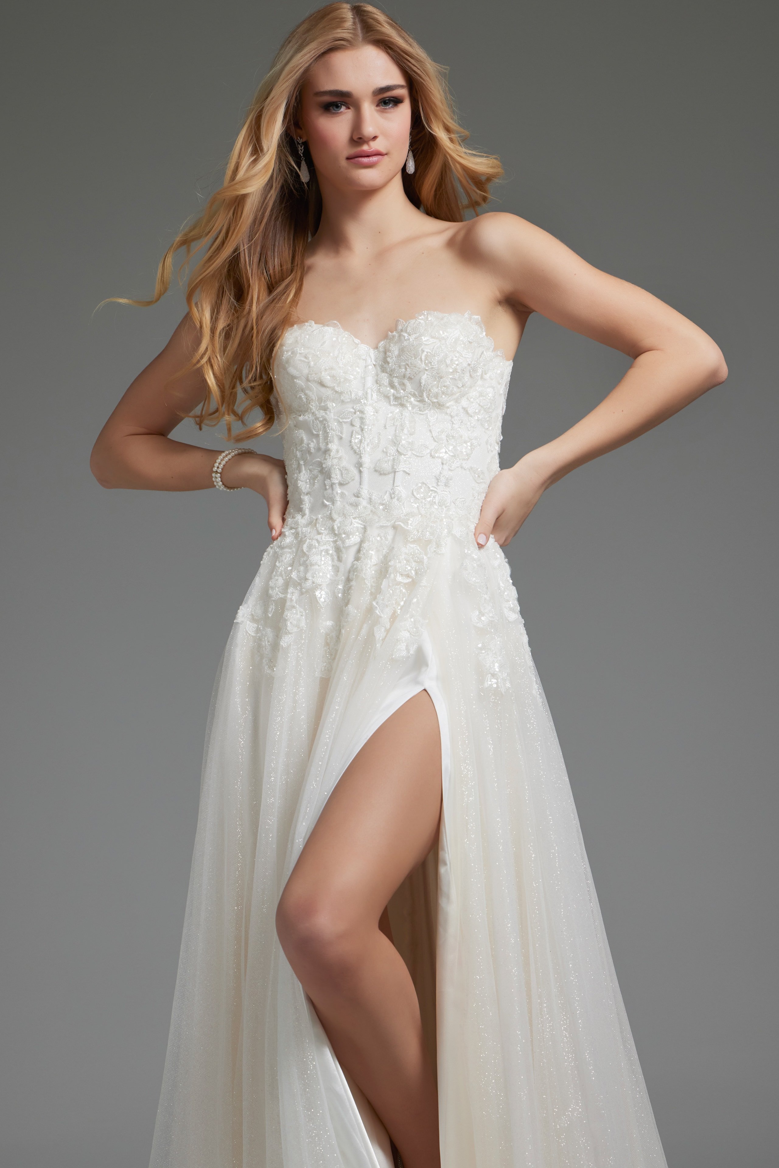 This enchanting strapless dress features delicate rosette details across the bodice, adding a touch of whimsy and romance. The high slit offers an alluring glimpse of the leg, complemented by the soft and flowing chiffon fabric that ensures a fairy-tale-like appearance. The dress is available in an elegant off-white color and has a floor-length silhouette, making it perfect for formal events or weddings.