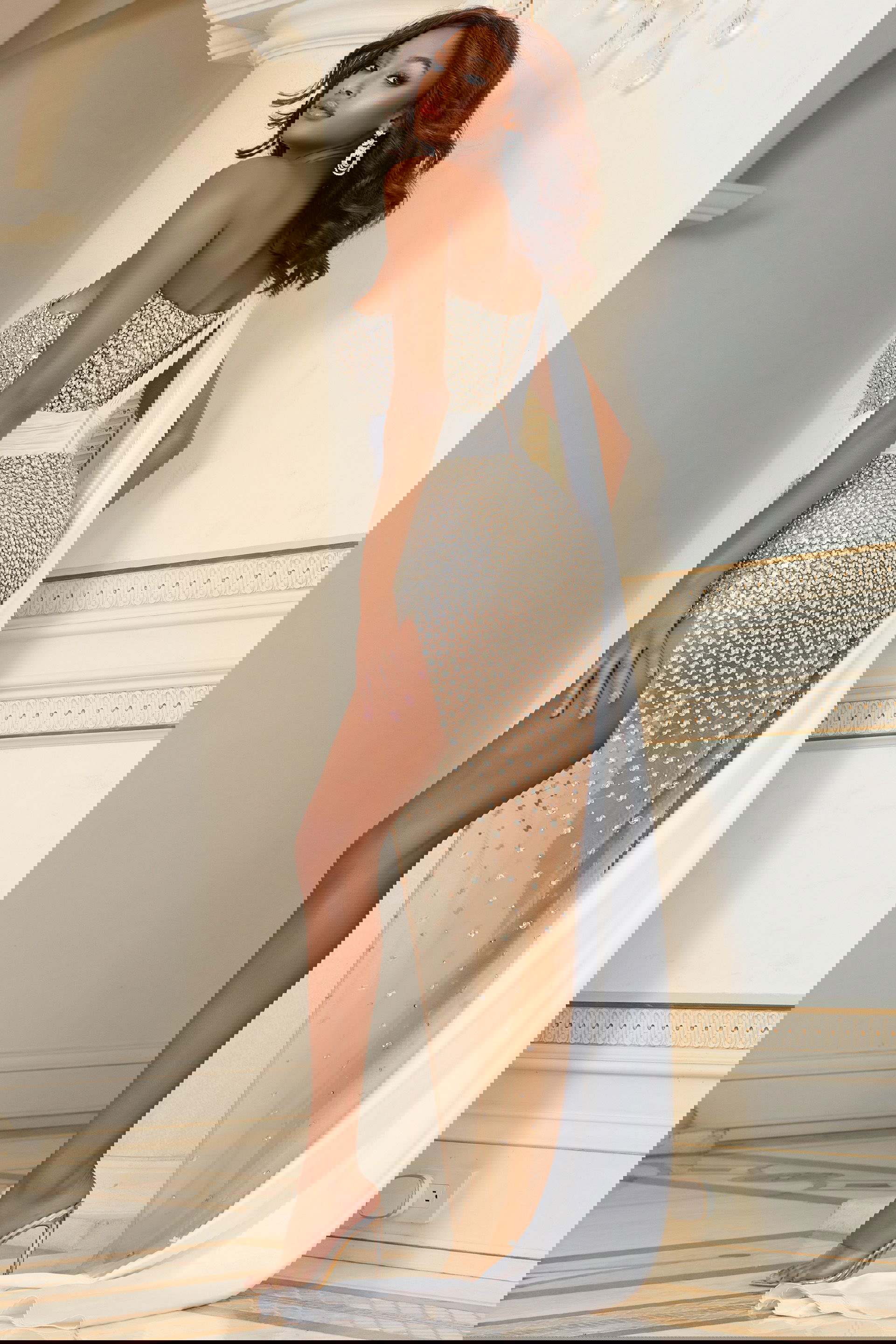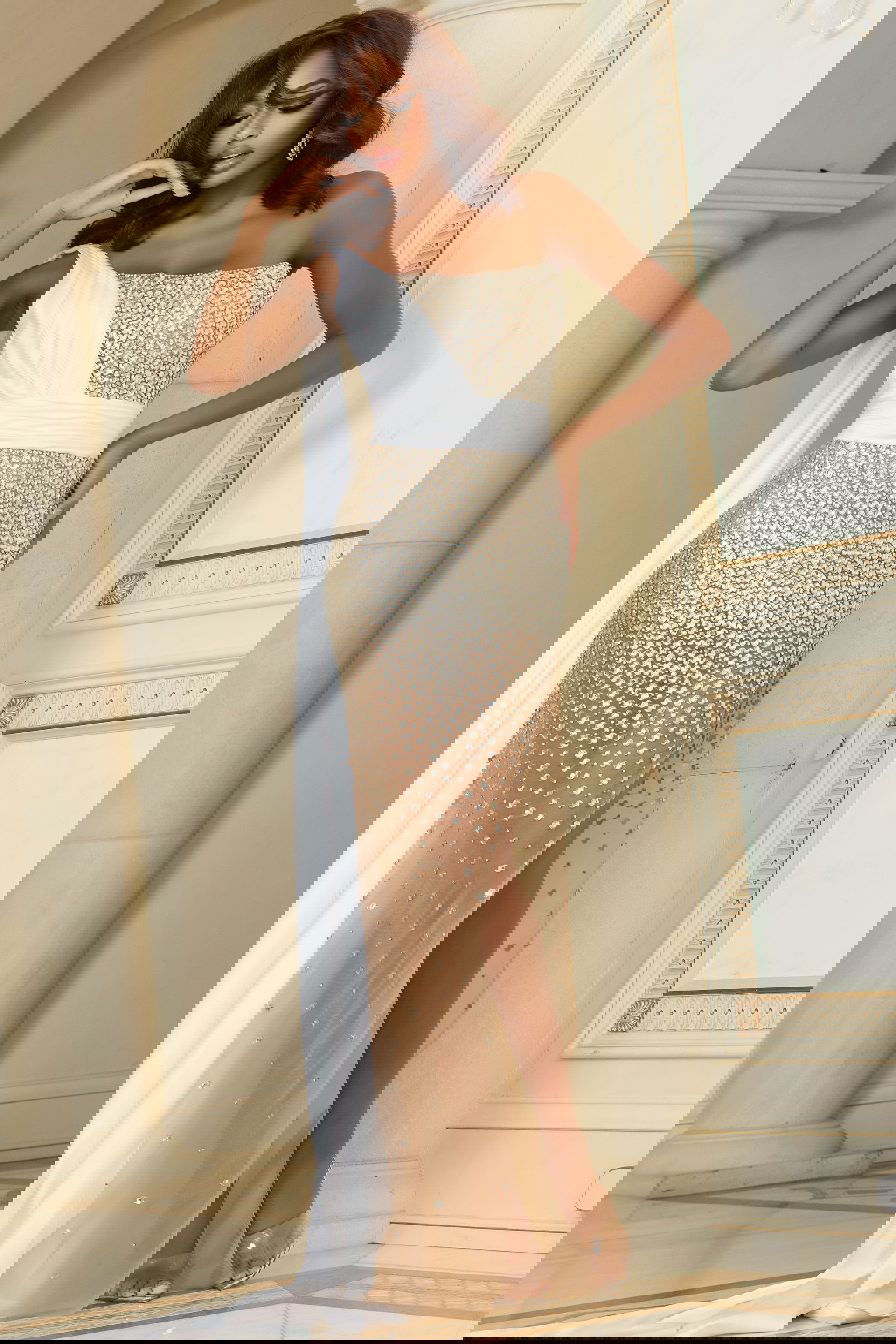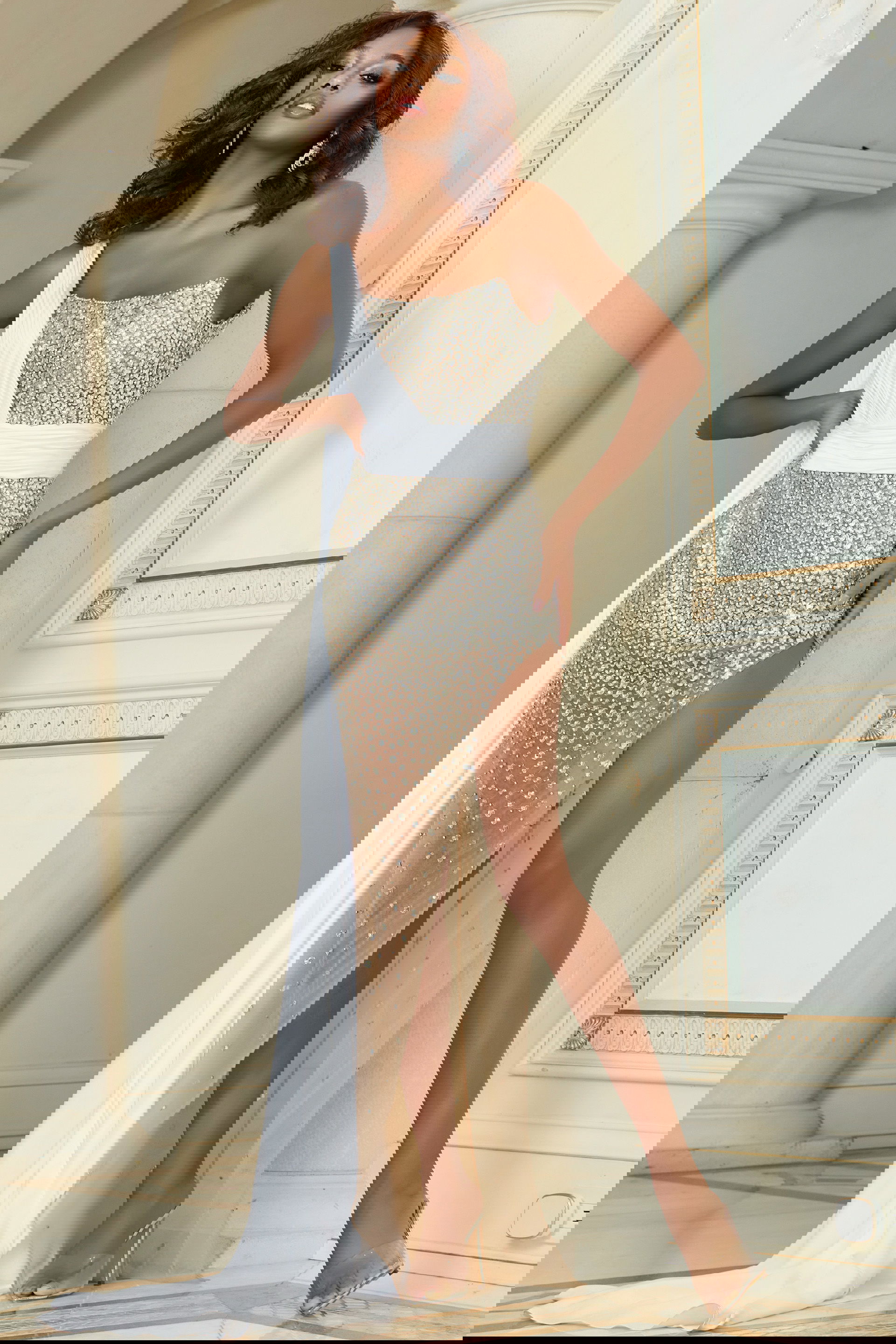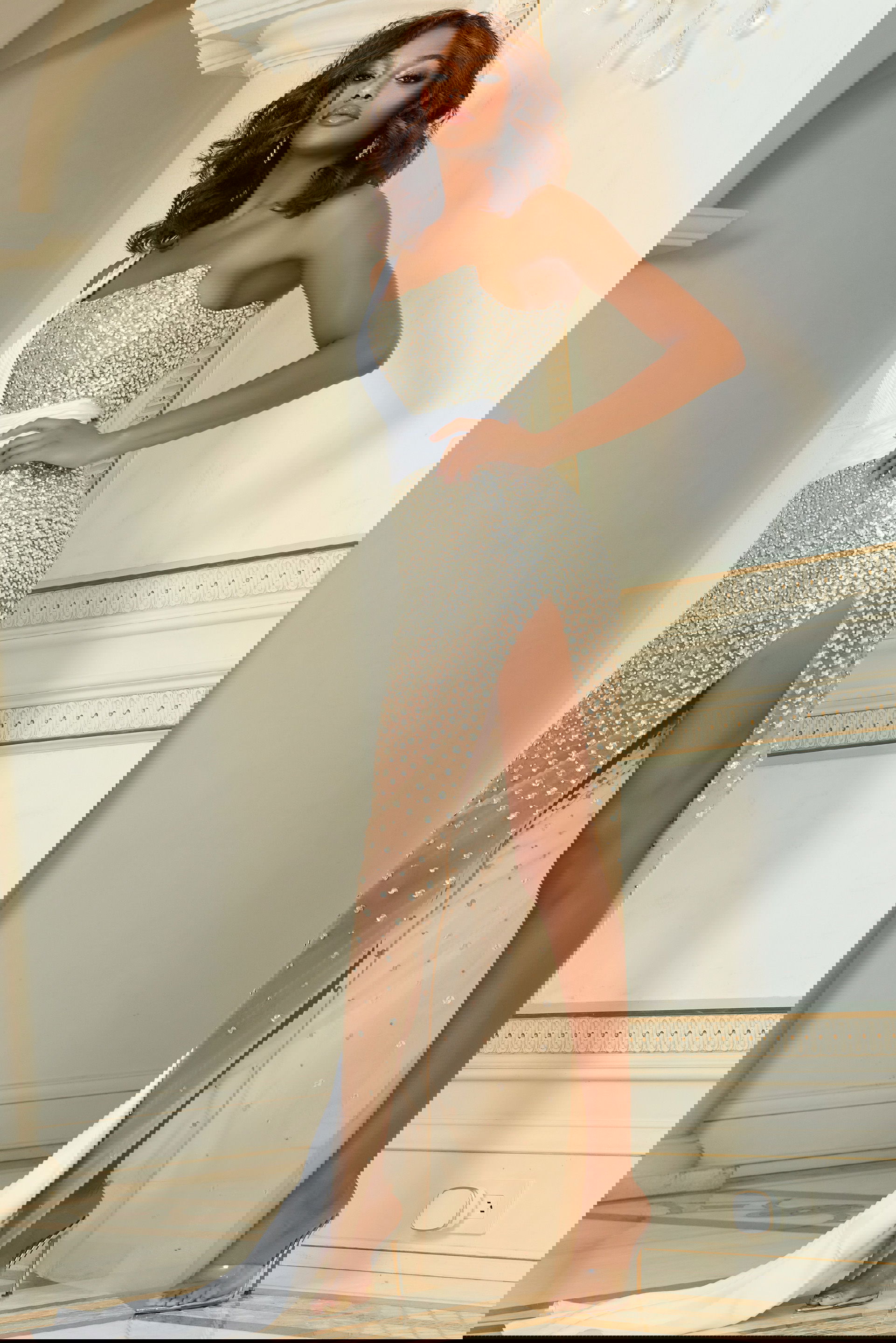 This exquisite gown offers a striking one-shoulder neckline that adds a touch of modern elegance. The full-length column silhouette gracefully hugs the body, embellished with sparkling beads. A dramatic sheer overlay cascades into a train, adding a captivating element to every step. Perfect for making an entrance at any formal occasion.