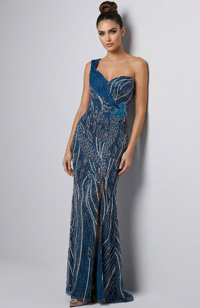 One Shoulder Beaded Tulle Evening Gown 49732