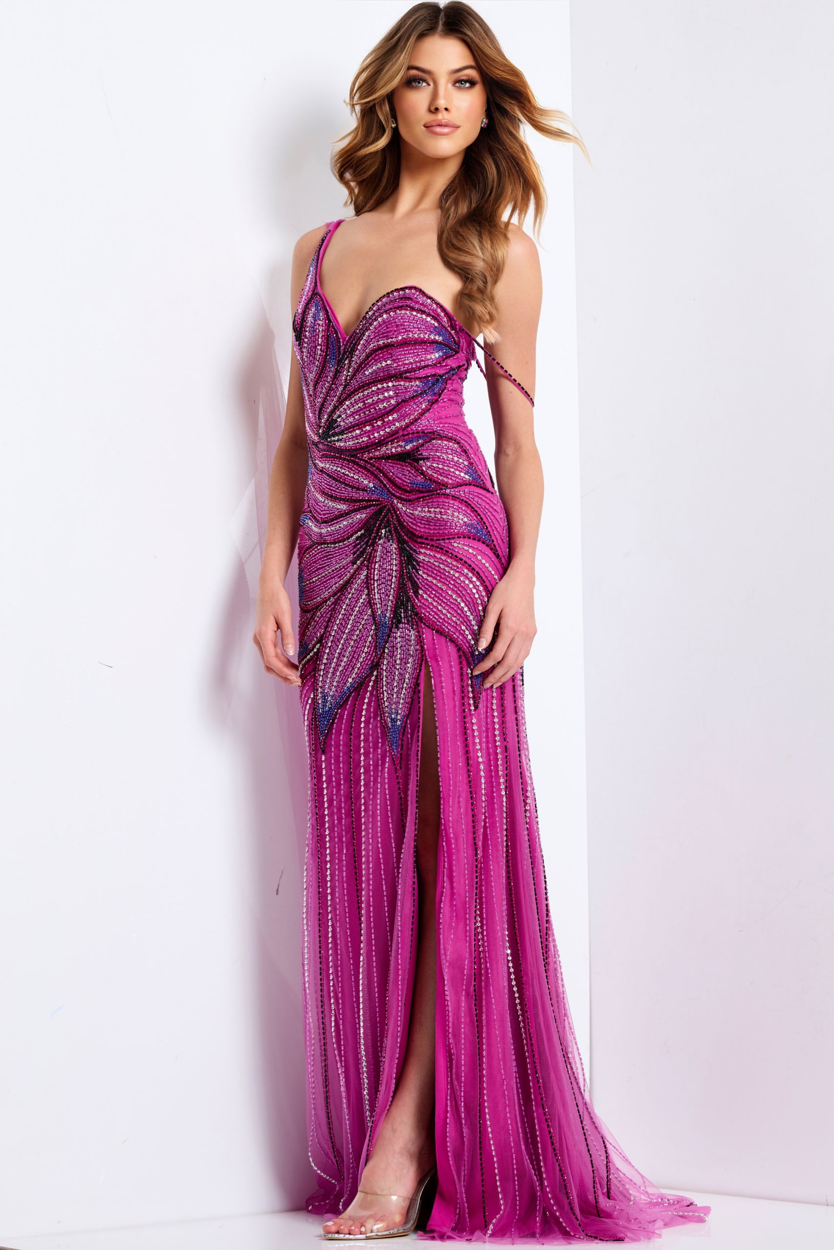 Intricate Beading, Floral Motif Design, High Slit, Sheer Overlay Cape