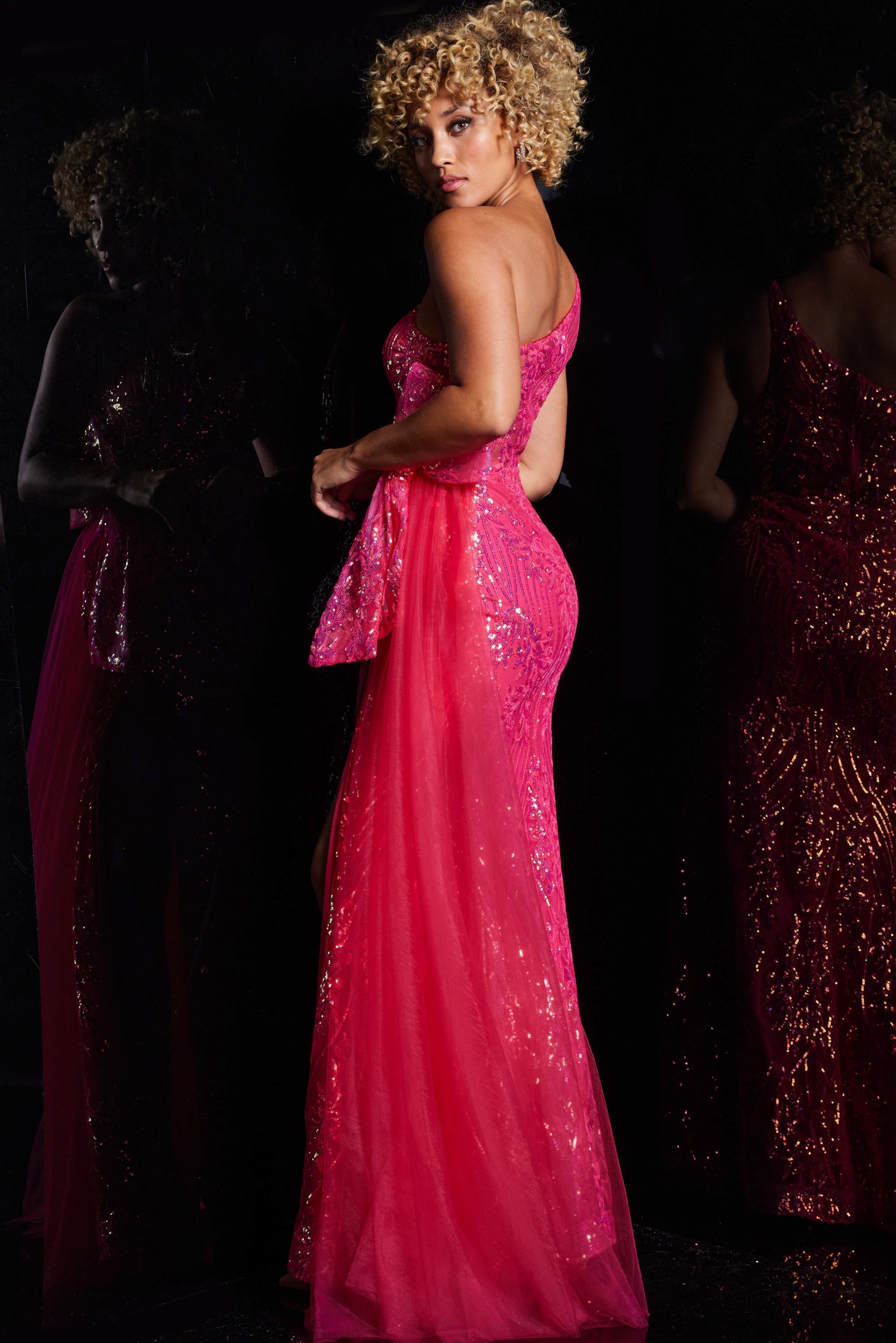 Exude elegance in this one-shoulder sequin mermaid gown, featuring a high slit and an enchanting floor-length design. The tulle fabric overlay adds a touch of ethereal beauty, making it perfect for any formal occasion. This sexy mermaid silhouette is fitted through the bodice and hips, flaring out at the knee for a dramatic effect.