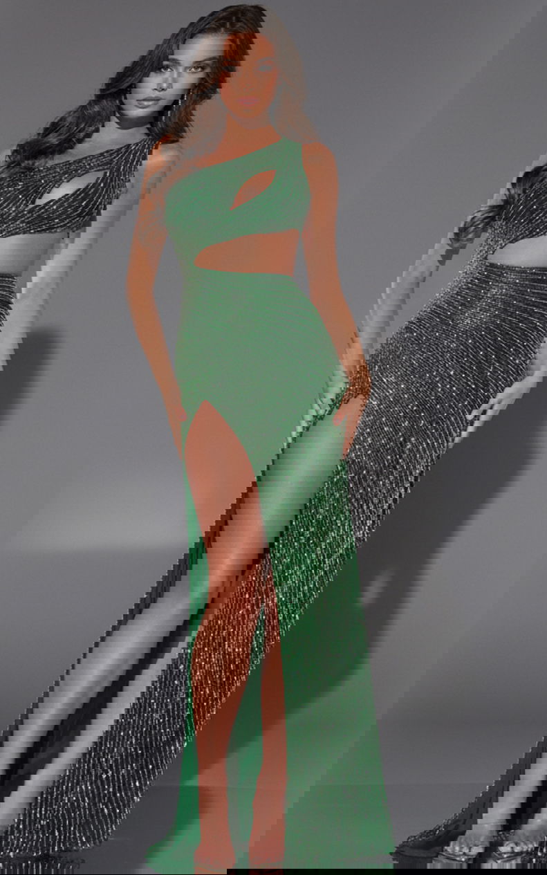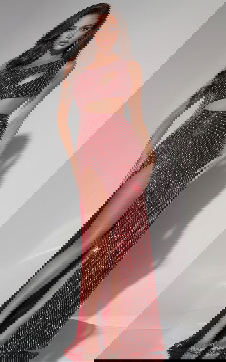 This stunning gown features a floor-length silhouette accentuated by a high slit, adding a dramatic flair. The dress is adorned in luxurious black with sparkling embellishments, creating a captivating shimmer. The asymmetrical neckline and sleeveless design enhance its modern aesthetic. A unique cutout at the waist further elevates the style, offering a chic and contemporary look.