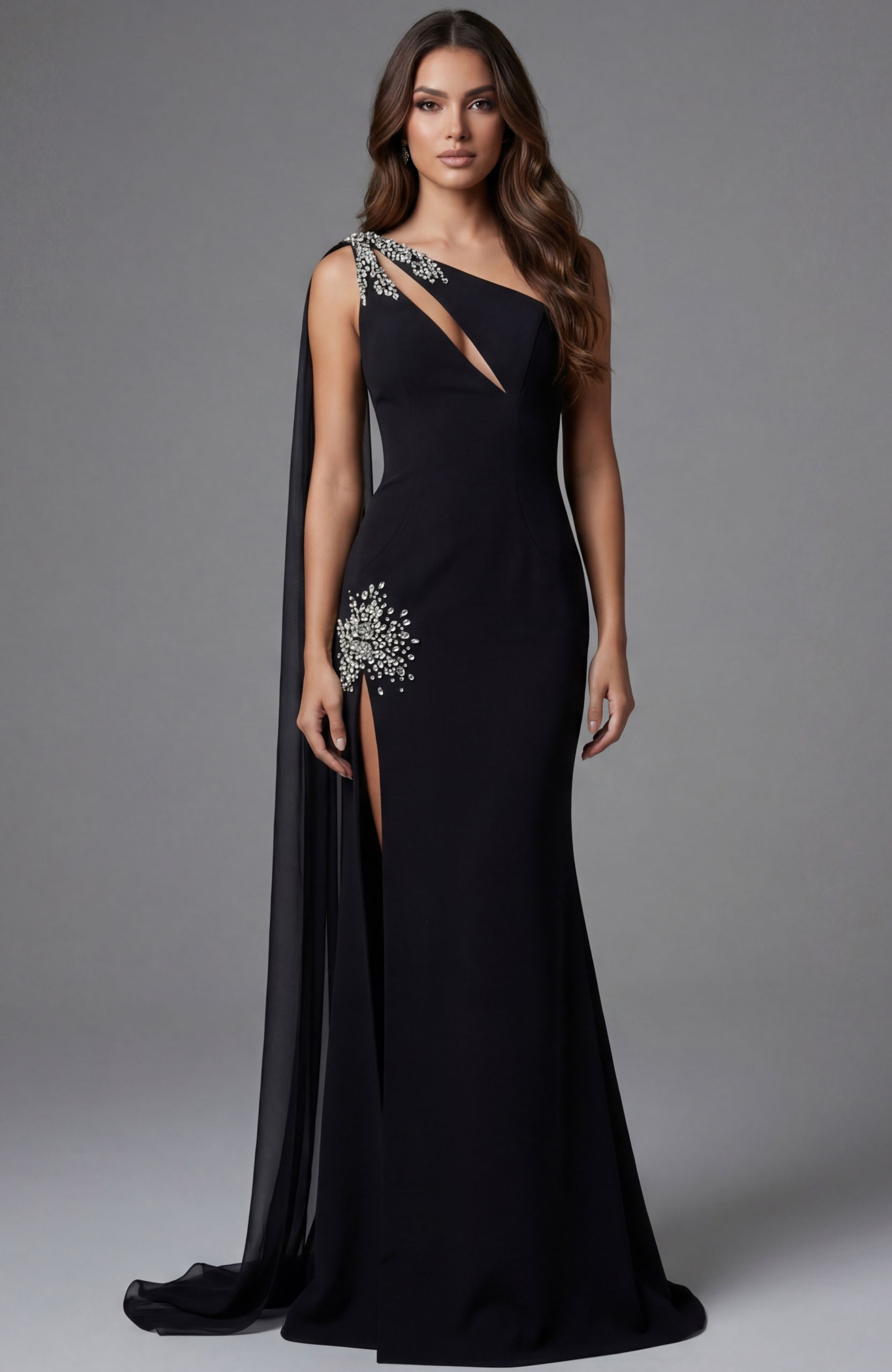 One Shoulder Gown With Embellished Cape Sleeve 45125