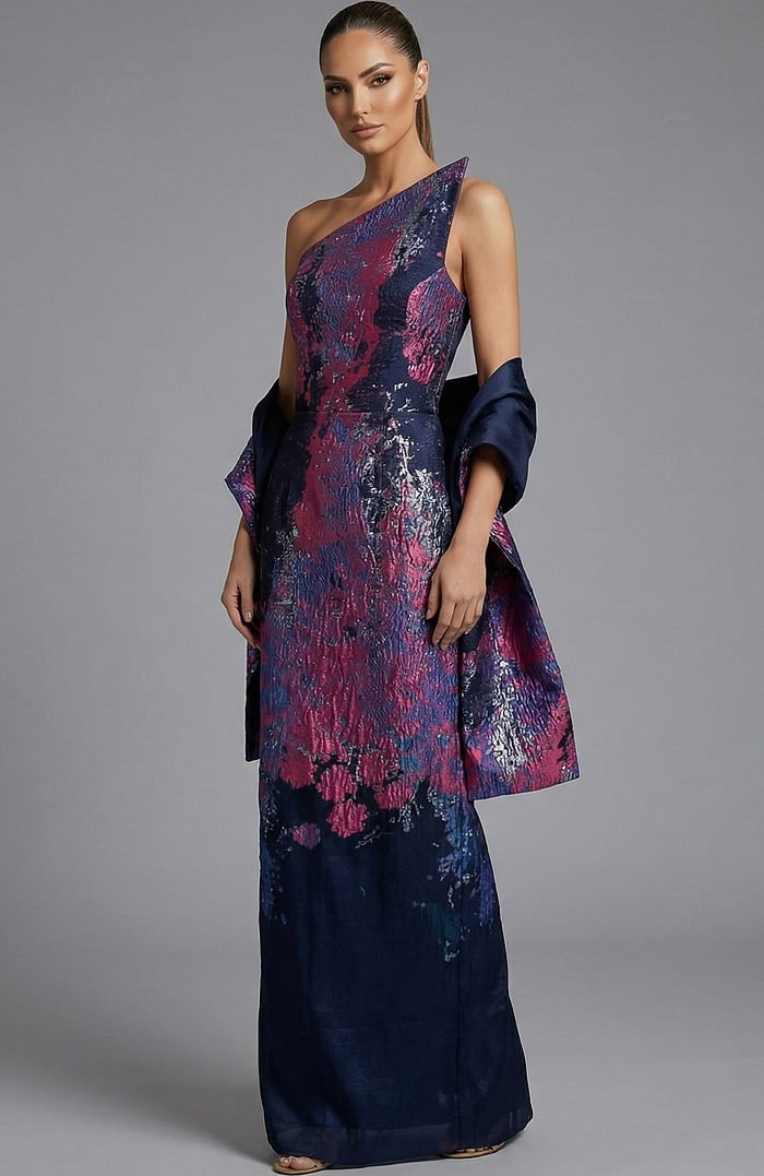One Shoulder Metallic Evening Gown With Peplum Detail 49060