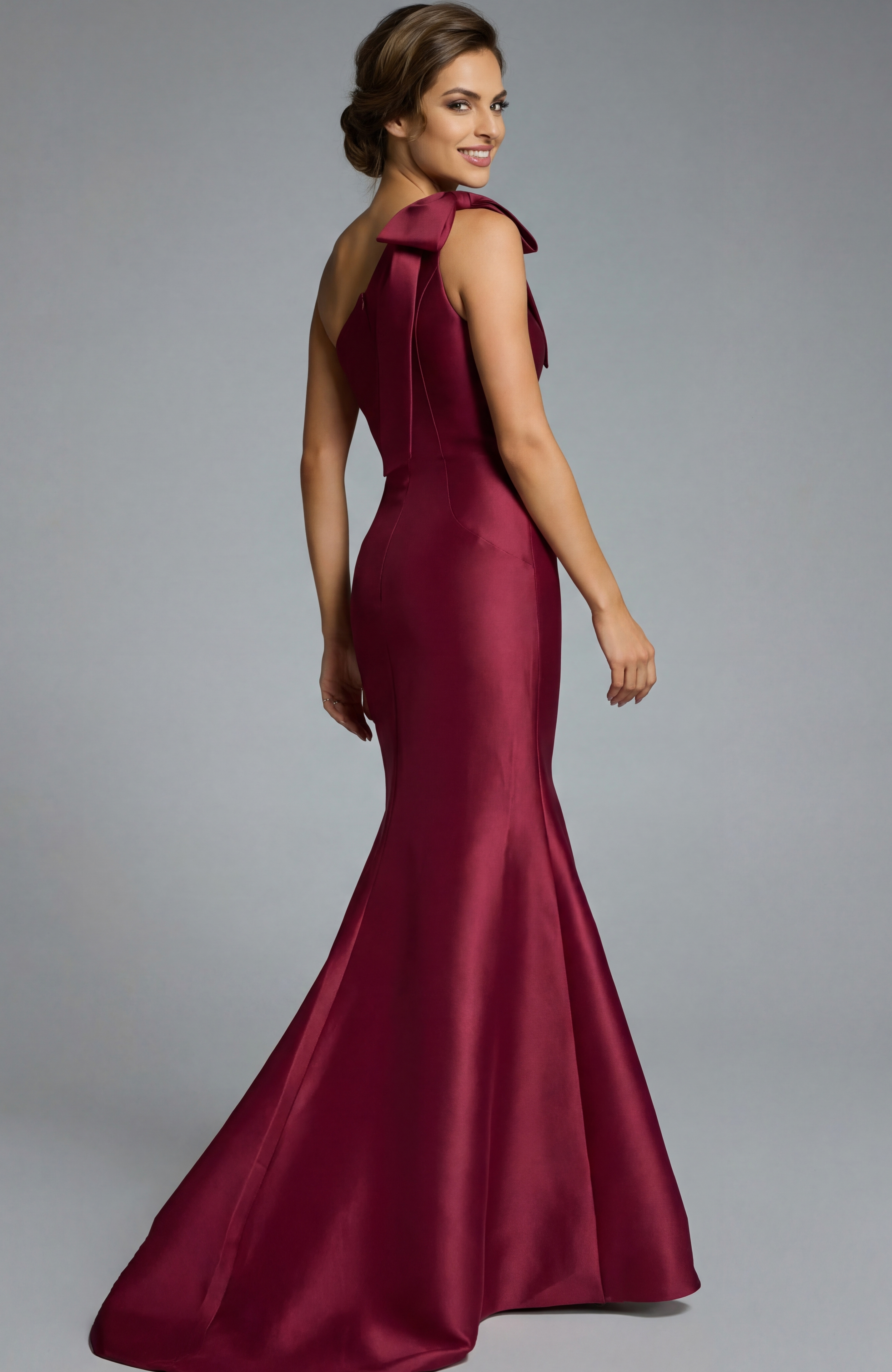 This elegant gown in a rich burgundy hue features a graceful mermaid silhouette that accentuates the figure. The dress showcases a sophisticated one-shoulder neckline with a dramatic bow detail, adding a touch of femininity. The fitted bodice flows seamlessly into the flared hem, creating a timeless and glamorous look. Perfect for evening events or formal occasions, this dress is a statement of refined elegance.