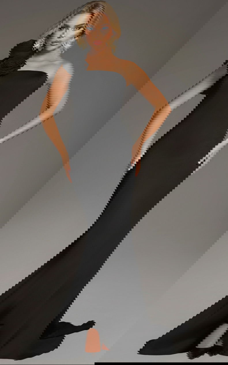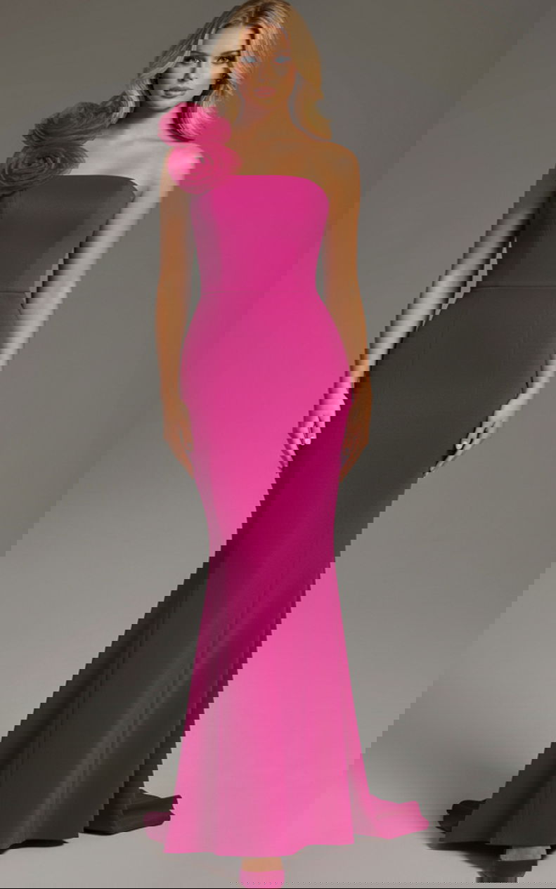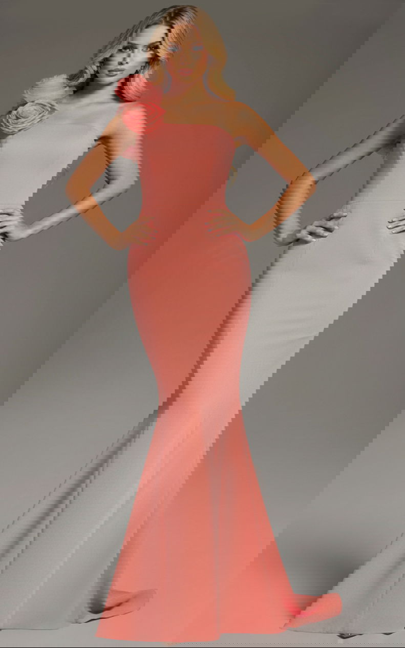 This elegant dress features a timeless mermaid silhouette, fitted through the bodice and hips with a graceful flare at the hem. The one-shoulder neckline is adorned with a striking floral detail, adding a touch of sophistication and charm. Designed with a floor-length cut, this gown exudes elegance, making it perfect for any formal occasion.