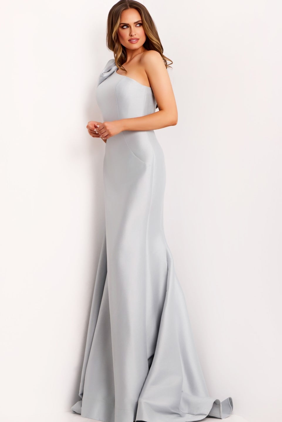 Exude elegance in this exquisite one-shoulder mermaid gown, featuring a floor-length silhouette that gracefully hugs the body before flaring out at the hem. The standout detail is an oversized, dramatic bow on the shoulder that cascades down the back, adding a unique and sophisticated touch. Crafted with precision, this gown offers a fitted bodice that accentuates the waist and hips, creating a stunning silhouette perfect for any formal occasion.