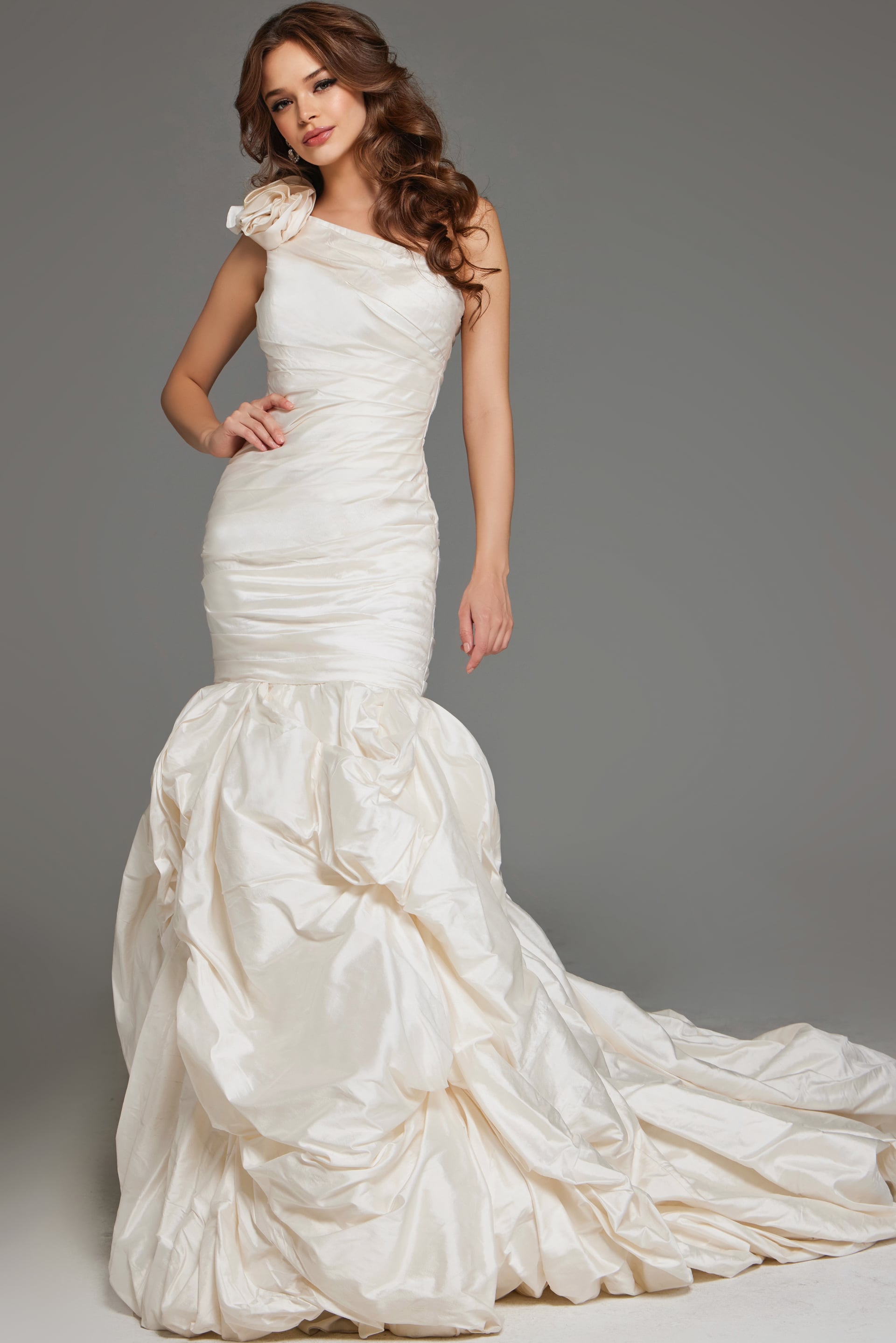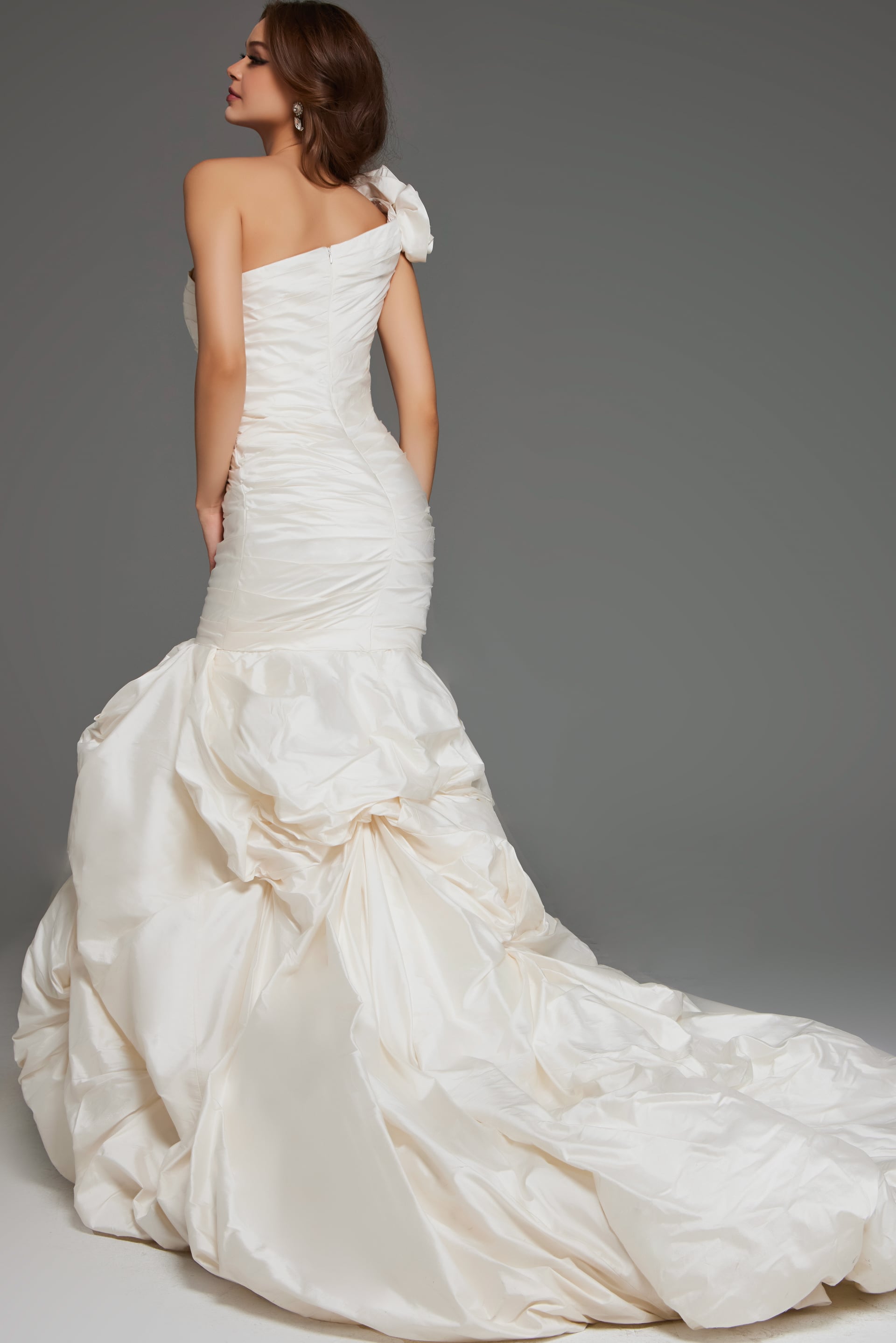 One-Shoulder Mermaid Wedding Gown with Dramatic Train JB07179. Embrace the epitome of elegance with this stunning mermaid wedding gown. Meticulously crafted from luxurious satin, this dress features a flattering one-shoulder neckline adorned with a rosette detail. The gown is ruched to perfection, emphasizing a slim, figure-hugging silhouette that flares out into a dramatic train, promising a breathtaking entrance. The closed back style adds a refined touch, while the floor-length design completes this masterpiece, making it an exceptional choice for the modern bride seeking a timeless yet fashion-forward look.