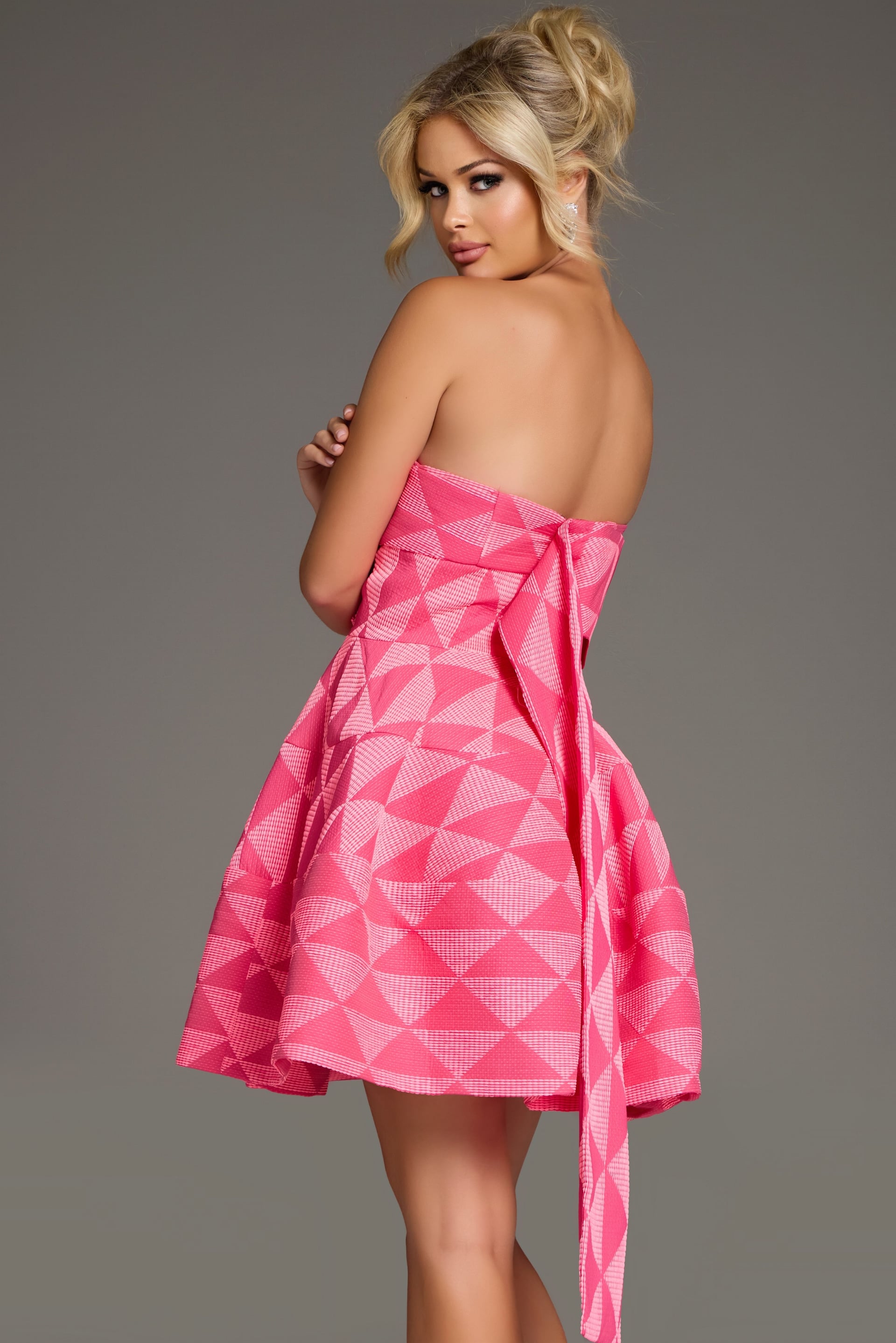 This playful short dress in eye-catching pink features a modern A-line silhouette with an asymmetrical neckline. The unique cutout detail at the bodice adds a touch of intrigue, while the high-low asymmetrical strap provides a contemporary edge. The dress is sleeveless and designed to accentuate the waist, flowing into a flared skirt that gives it a fun and flirty appeal. Perfect for cocktail events or a stylish night out, this dress is both bold and chic.