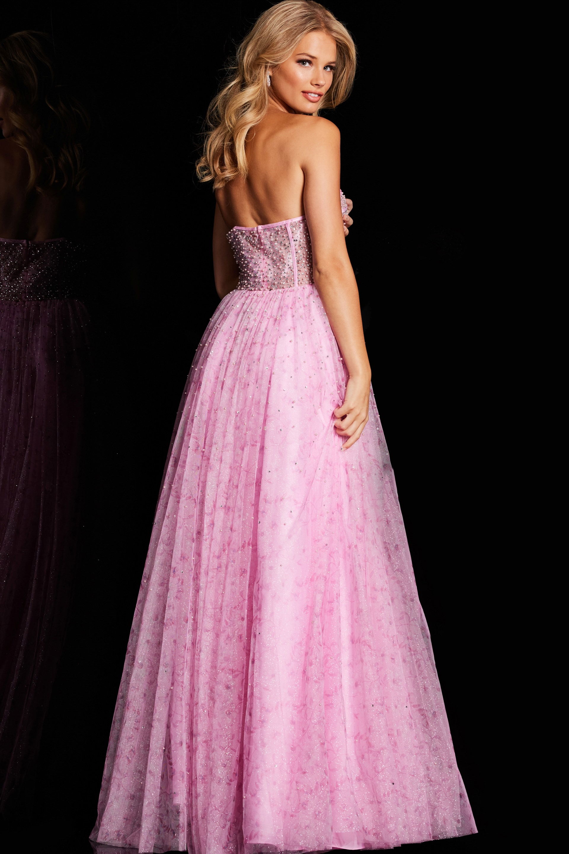 Make a statement in this enchanting strapless beaded corset gown. Crafted in elegant tulle, this gorgeous floor-length dress features a fitted bodice adorned with intricate beading, adding a touch of sparkle and luxury. The gown flows beautifully into an A-line silhouette and is complemented by a daring high slit. Perfect for prom, formal events, or any special occasion, this gown is sure to turn heads and make you feel like royalty.