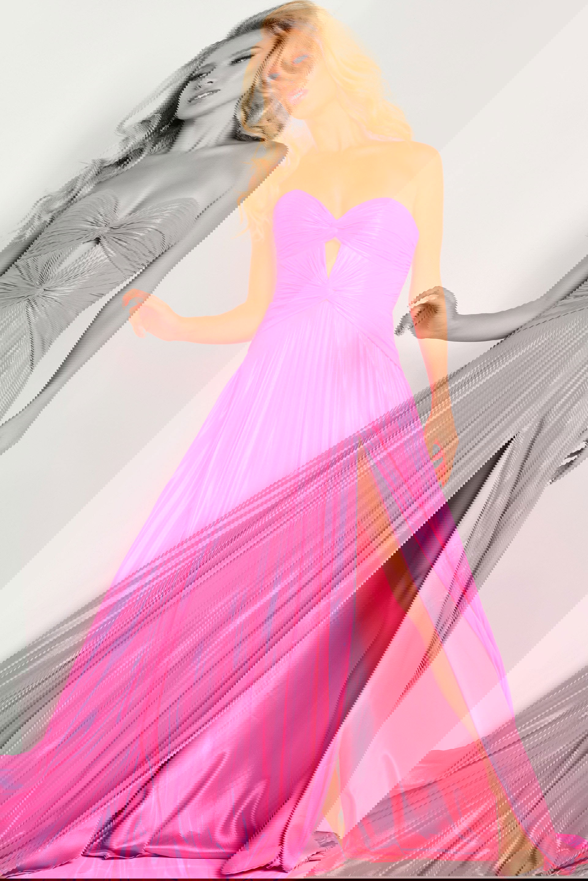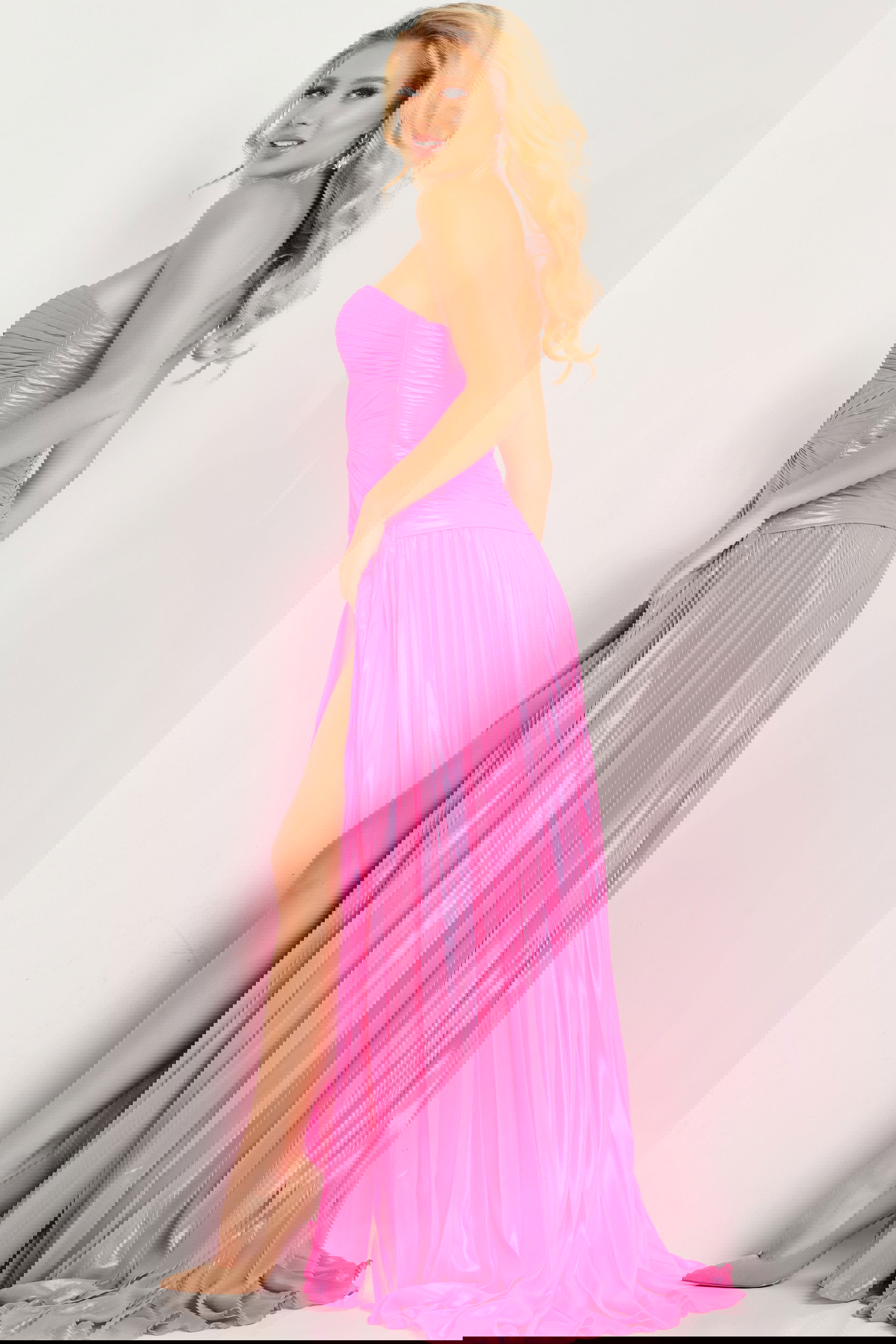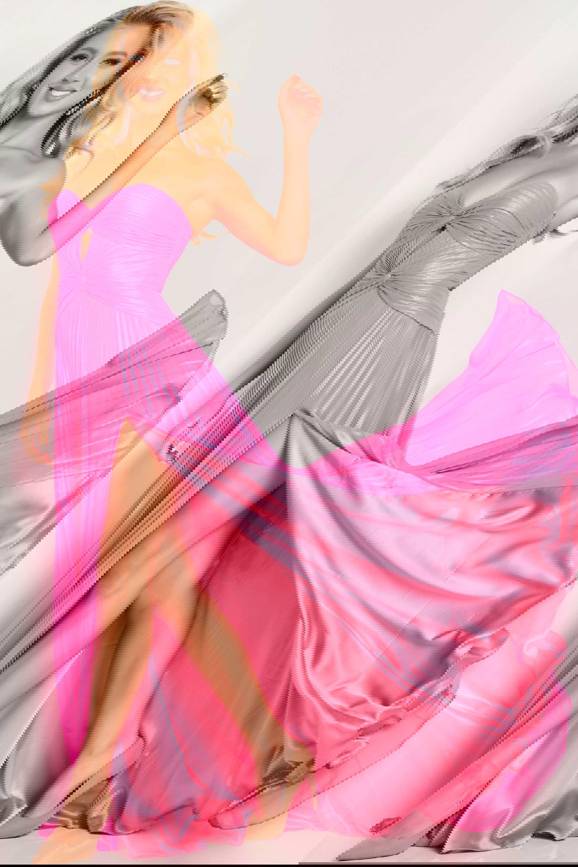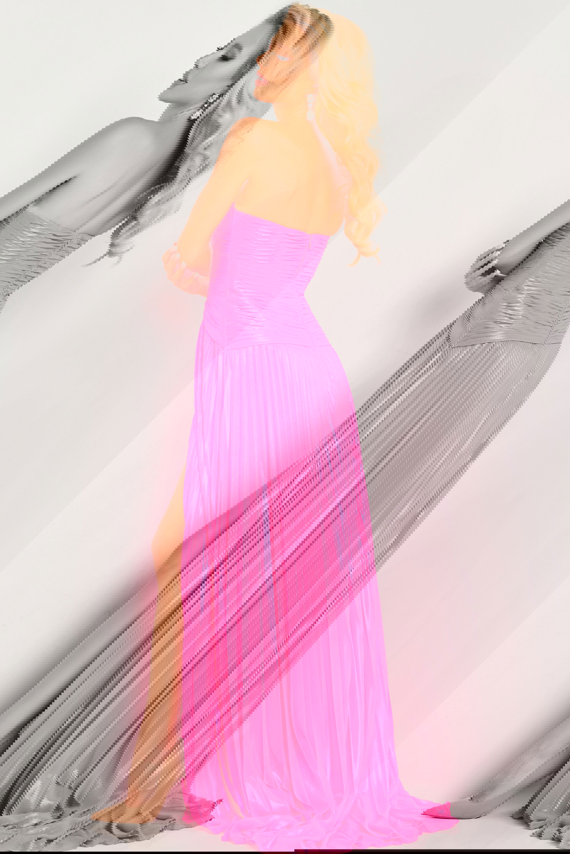 Pink metallic pleated bodice sheath prom dress with the keyhole on the bustline and high side slit with back zipper.