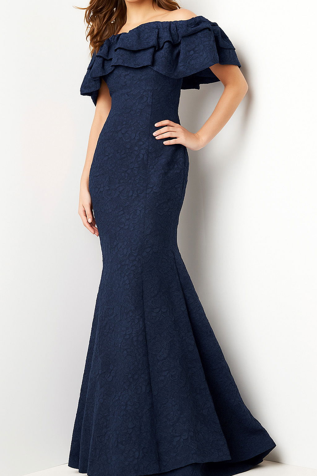 This elegant ruffled off-the-shoulder lace mermaid gown features a fitted bodice that flows seamlessly into a flattering mermaid silhouette, flaring out at the knee for a timeless look. Made from luxurious lace fabric, this floor-length dress showcases intricately detailed floral patterns, adding depth and dimension to its exquisite design. Perfect for any formal occasion, its off-the-shoulder neckline and voluminous ruffles offer a touch of romantic charm.