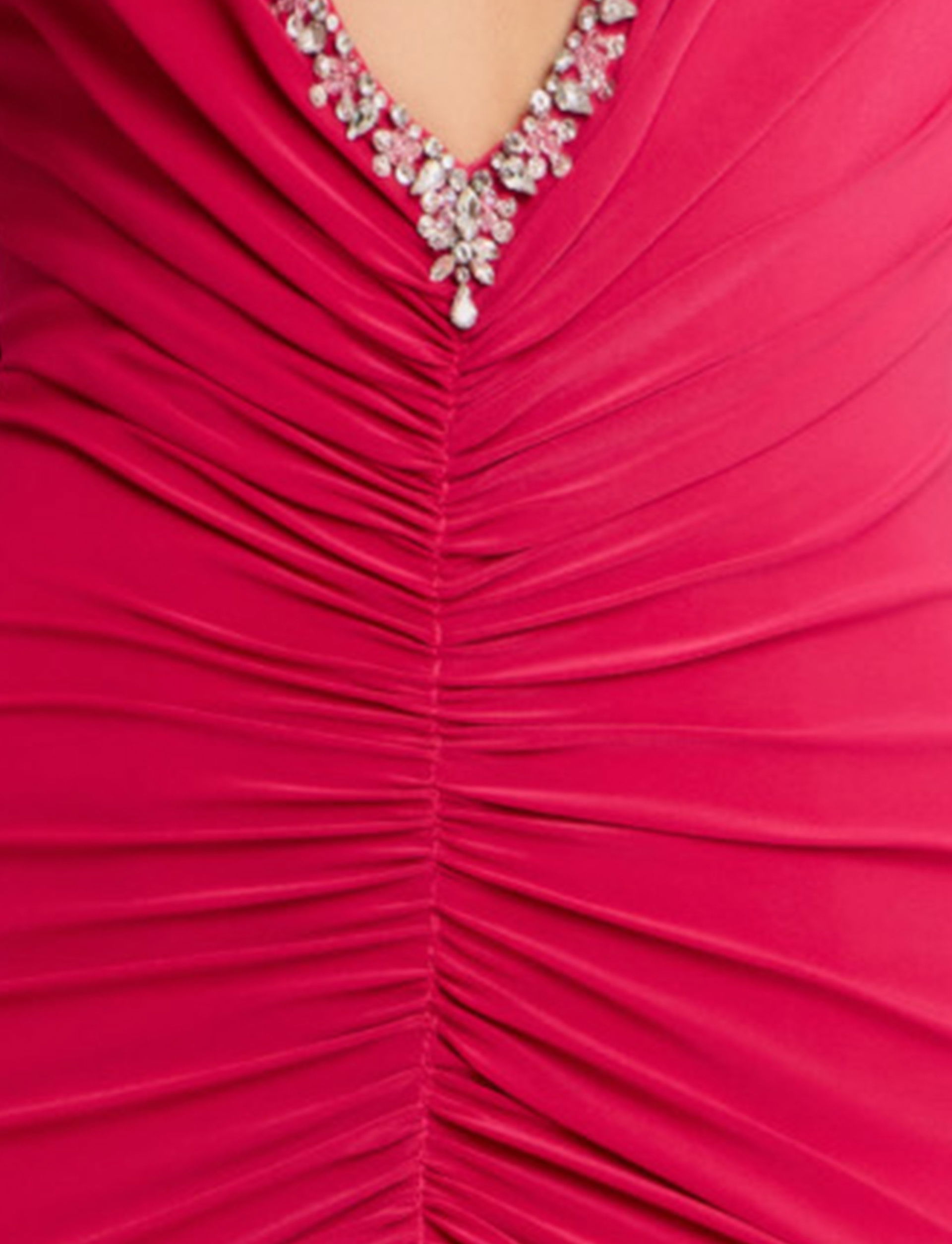 This stunning full-length gown features a daring plunging V-neckline embellished with crystal details that add a touch of glamour. The sheath silhouette is designed to flatter with its fitted style and subtle ruching along the bodice. Long sleeves provide elegance and sophistication, making this dress perfect for a formal event. The skirt gracefully flows to the floor, ensuring movement and grace with every step.