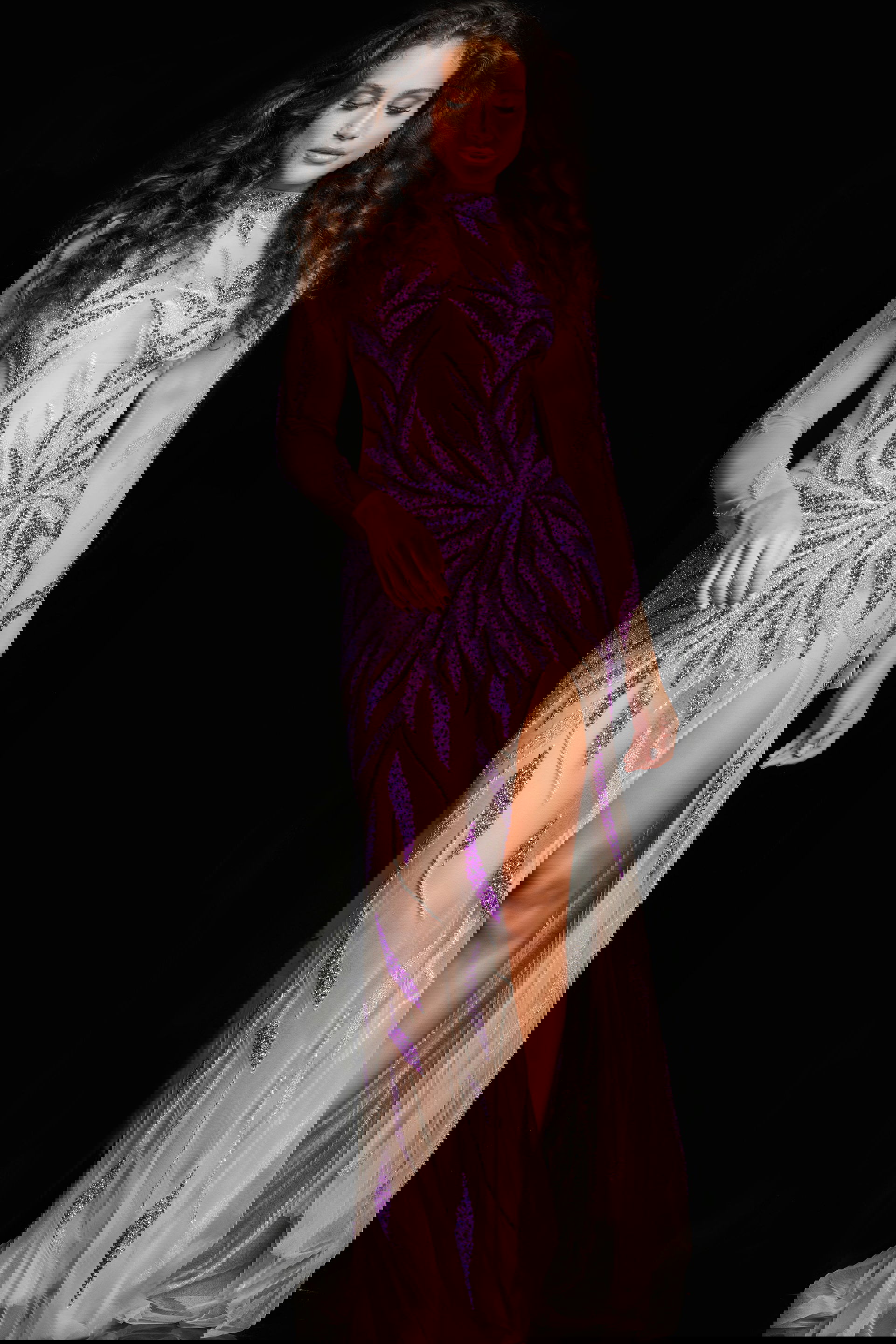 Crafted from delicate tulle, the gown provides a light and ethereal quality, enhancing its overall elegance. In a fitted silhouette, the dress features intricate beadwork, adding a touch of glamour and sparkle. The illusion details contribute to the gown’s modern aesthetic, with a high slit adding to its allure.