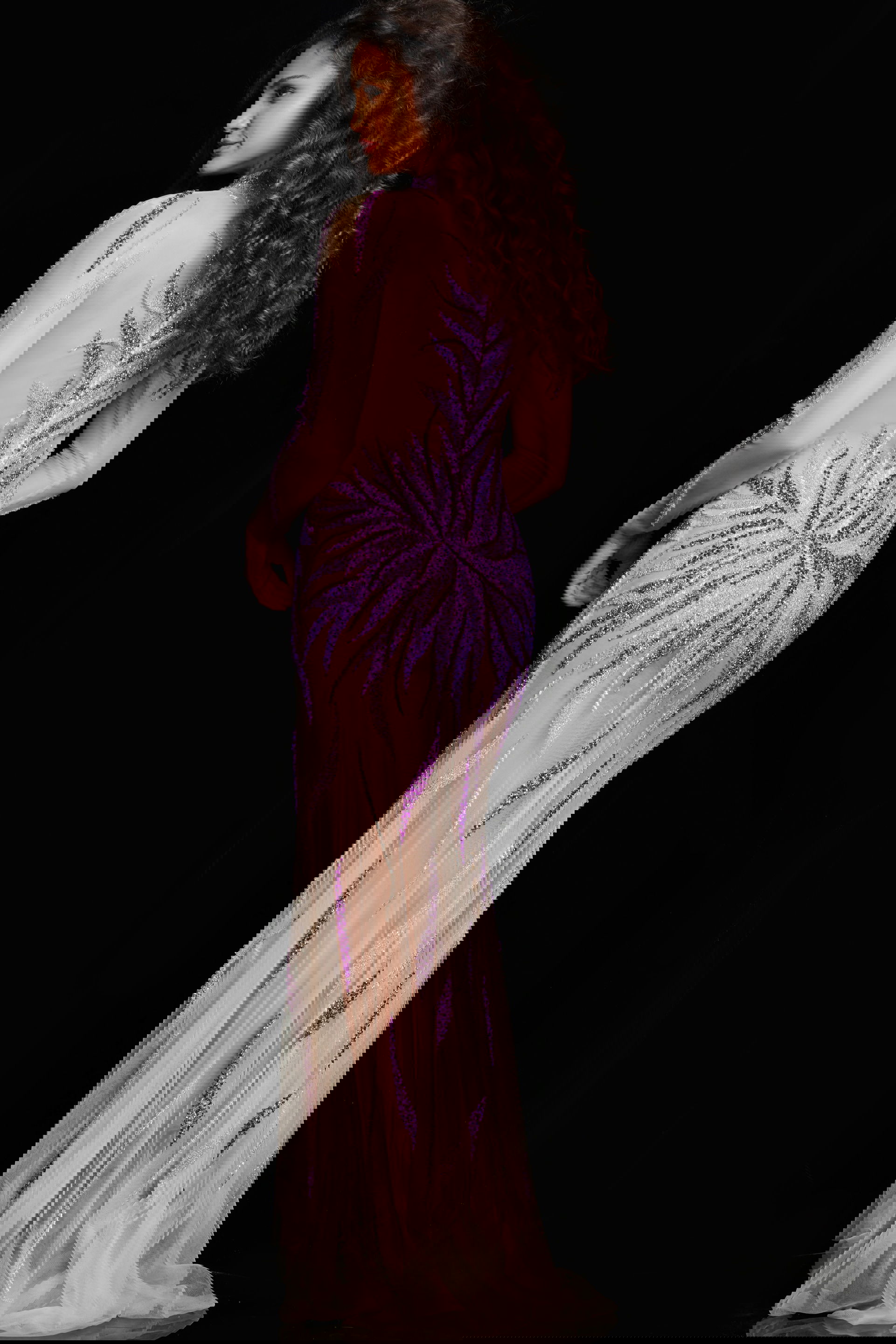 With a closed back, the dress maintains a polished and refined appearance. The high neckline adds a touch of sophistication to the ensemble, complemented by the long sleeves that bring an element of modesty and grace to the overall design.