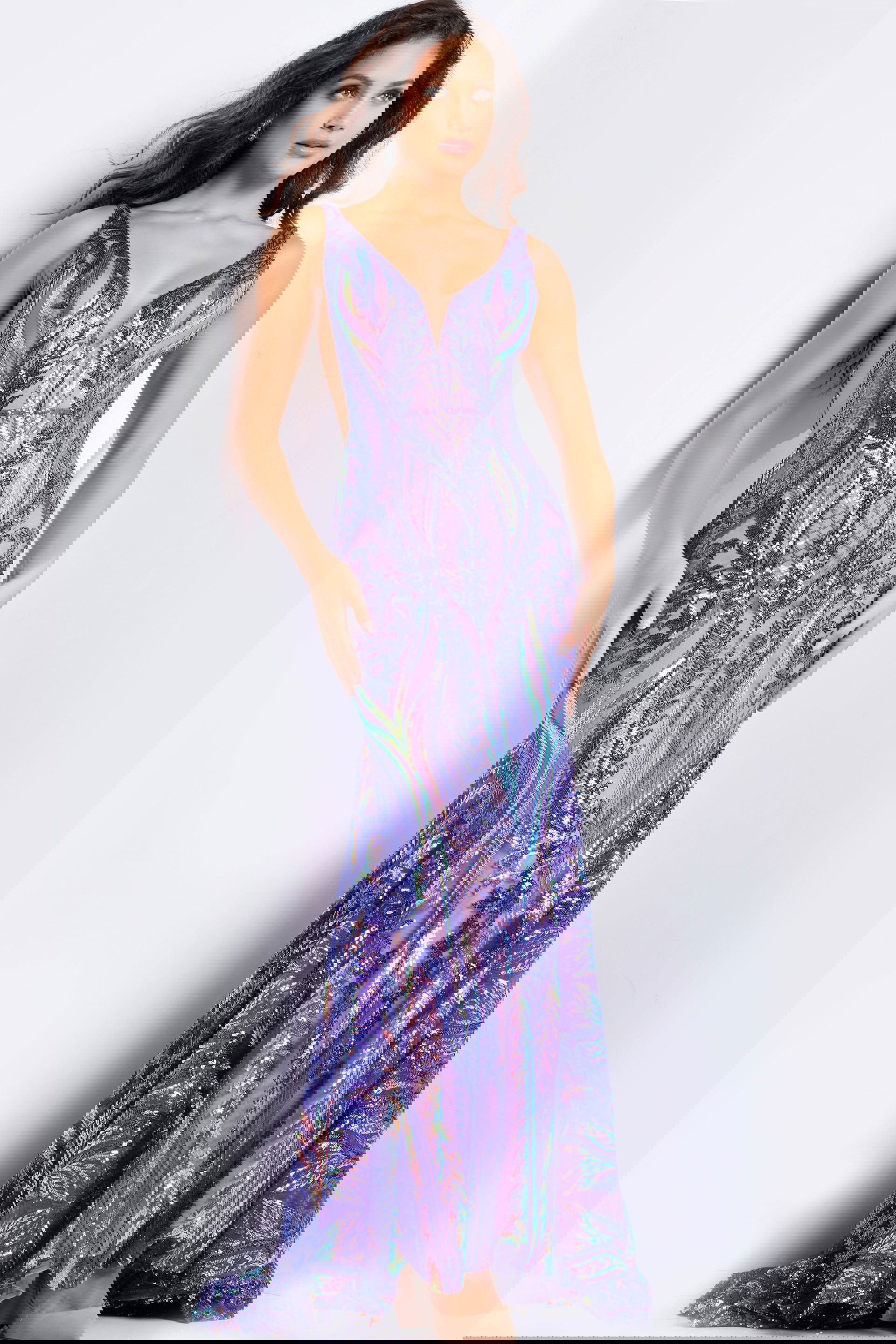Dazzle at any event with this Sequin Mermaid Gown. Featuring a captivating V-Neckline, sleeveless design, and intricate sequin details, this floor-length dress offers a stunning silhouette that hugs the bodice and flares out at the knee. Crafted from high-quality sheer fabric, this dress is perfect for showcasing elegance and glamour at any special occasion.
