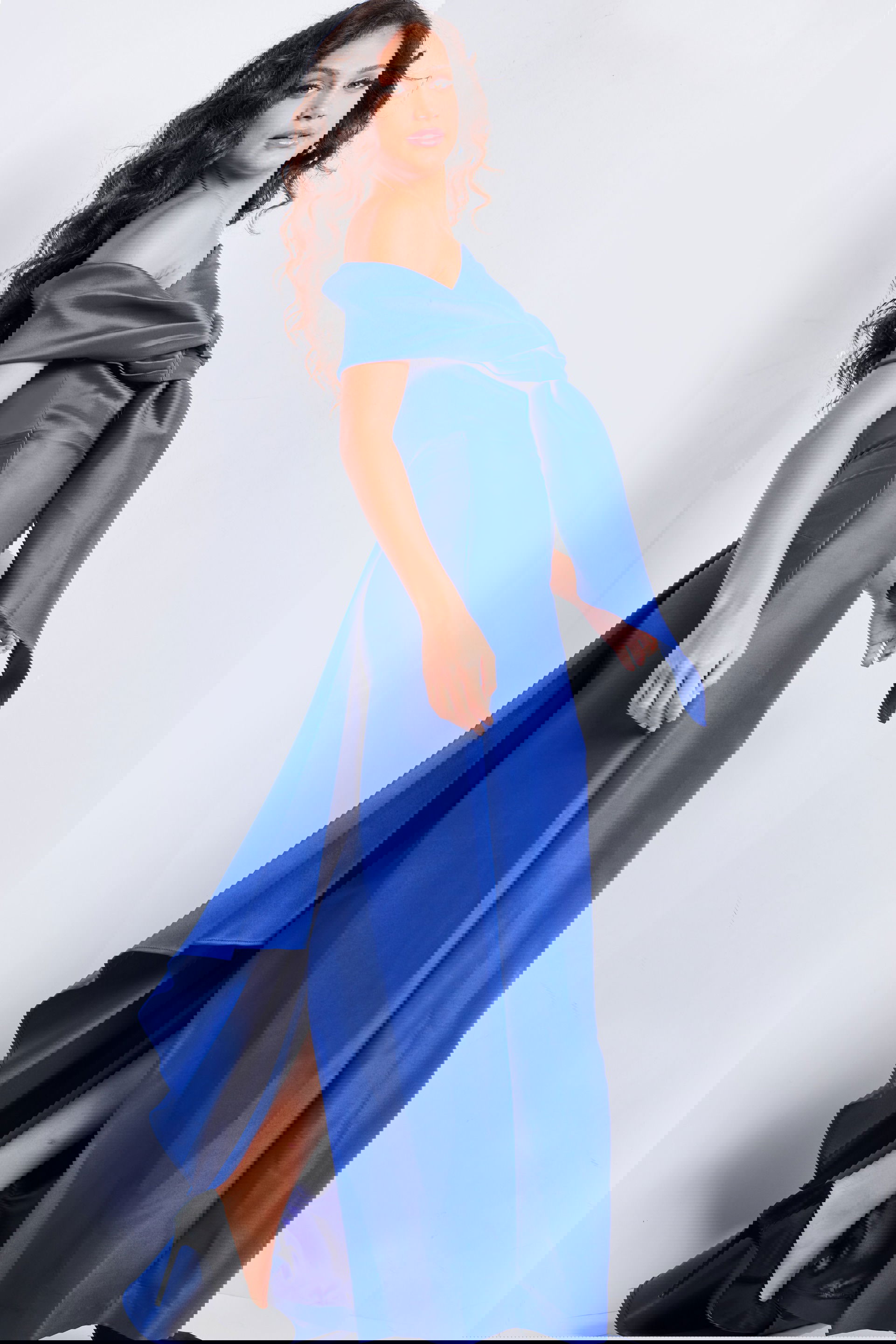 Details include a back slit, providing ease of movement and a touch of allure, as well as a long tail that adds drama and grandeur to the ensemble. The off-the-shoulder wrap enhances the gown’s overall elegance, creating a romantic and sophisticated silhouette.