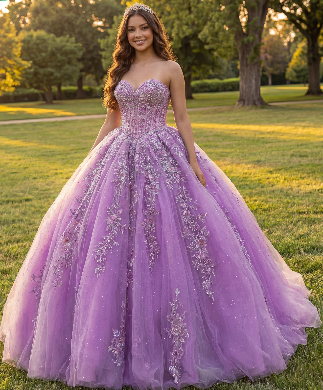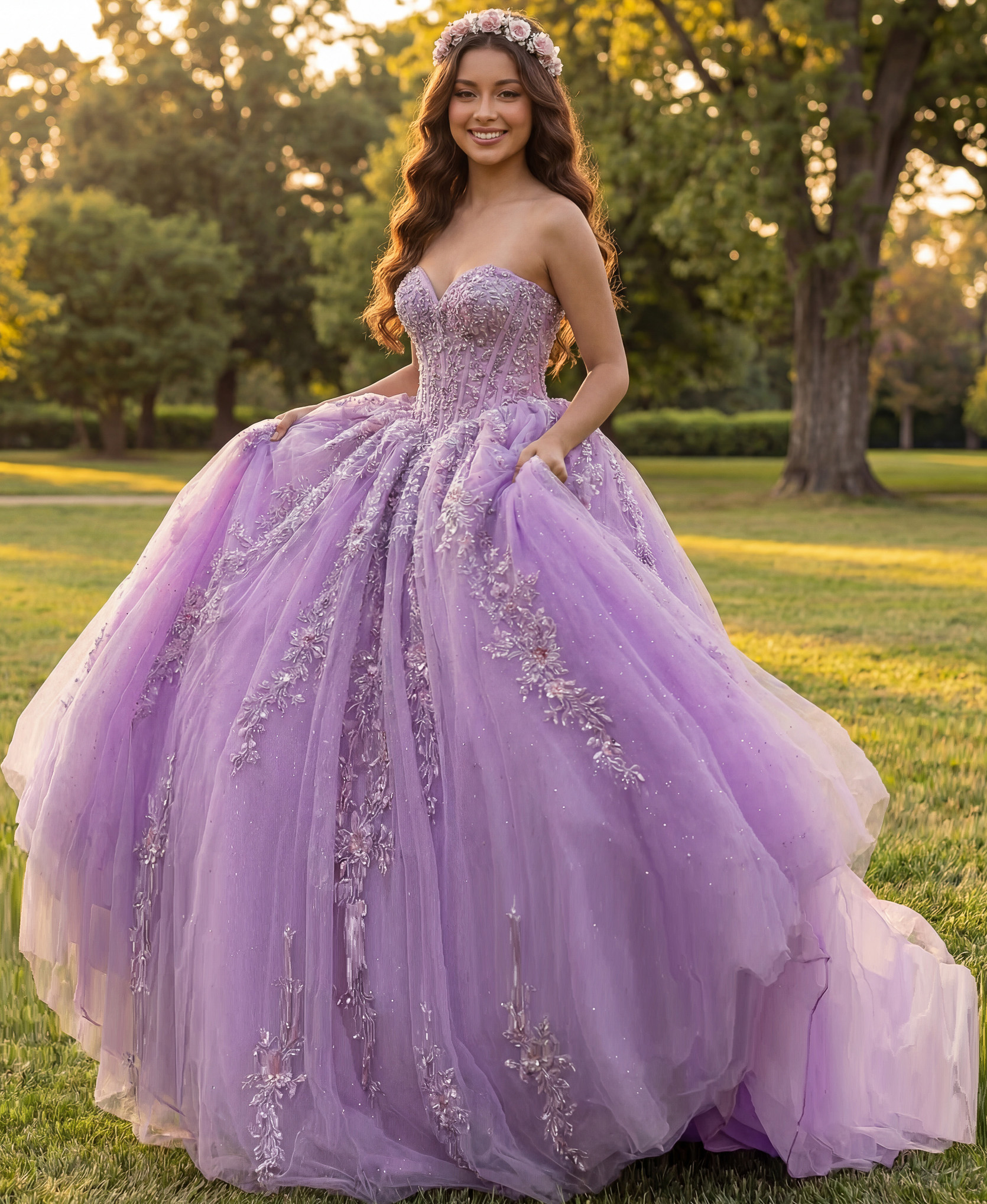 3D Floral Appliqués, Embroidered Lace, Beaded Accents, Glitter Tulle, Layered Skirt