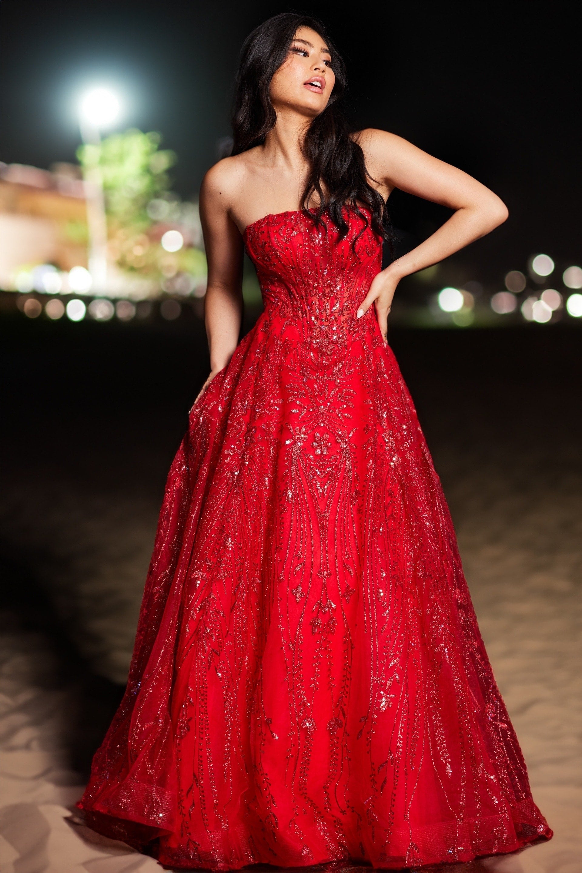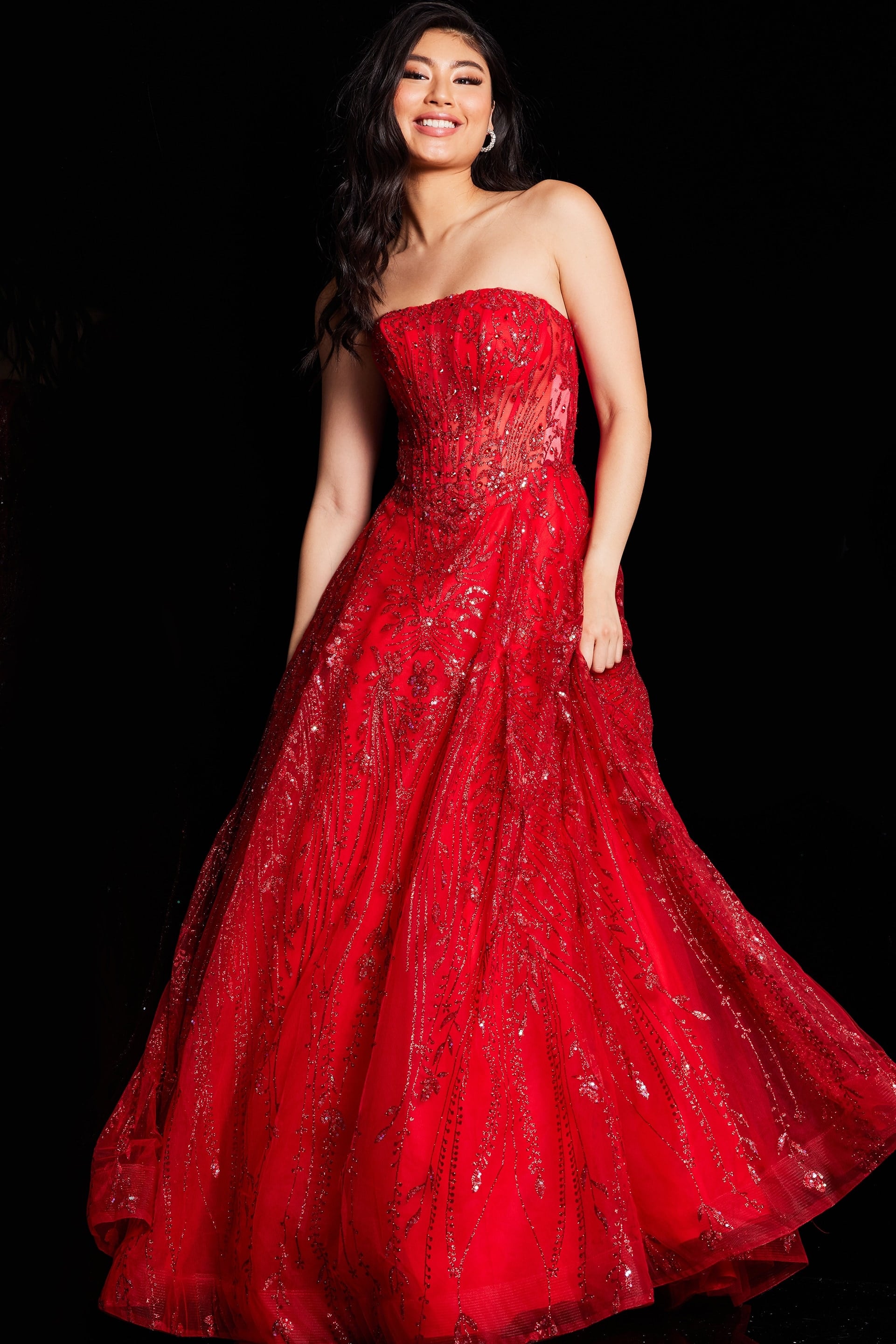 Step into the spotlight with this stunning strapless ballgown. Crafted in rich red, this dress features intricate beading throughout and is tailored from luxe tulle fabric. The full floor-length skirt flows magnificently, ensuring you make a grand entrance at any event. Perfect for prom, galas, and formal occasions.