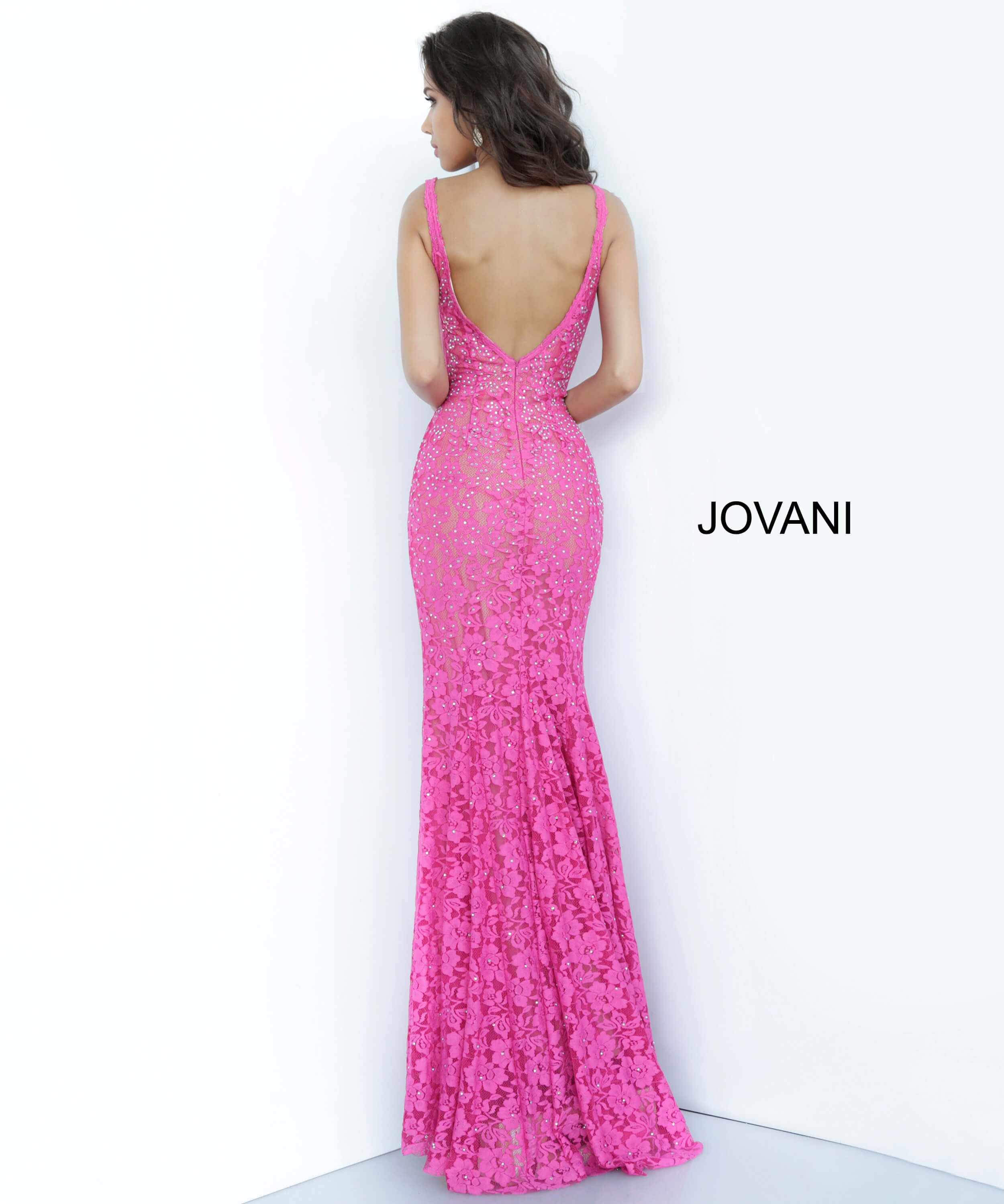 This red prom dress by Jovani is made of a gorgeous lace fabric. This sleeveless floor length form fitting dress features a plunging sheer V neckline, a mermaid skirt, sheer side panels and crystal embellishments. The back of the gown features a plunging open back and a concealed zipper that fastens the dress together. This dress is also available in black, navy and white. This gown looks stunning on girls who want to accentuate their curves. This prom dress is perfect for girls who want to look both sophisticated and sexy.