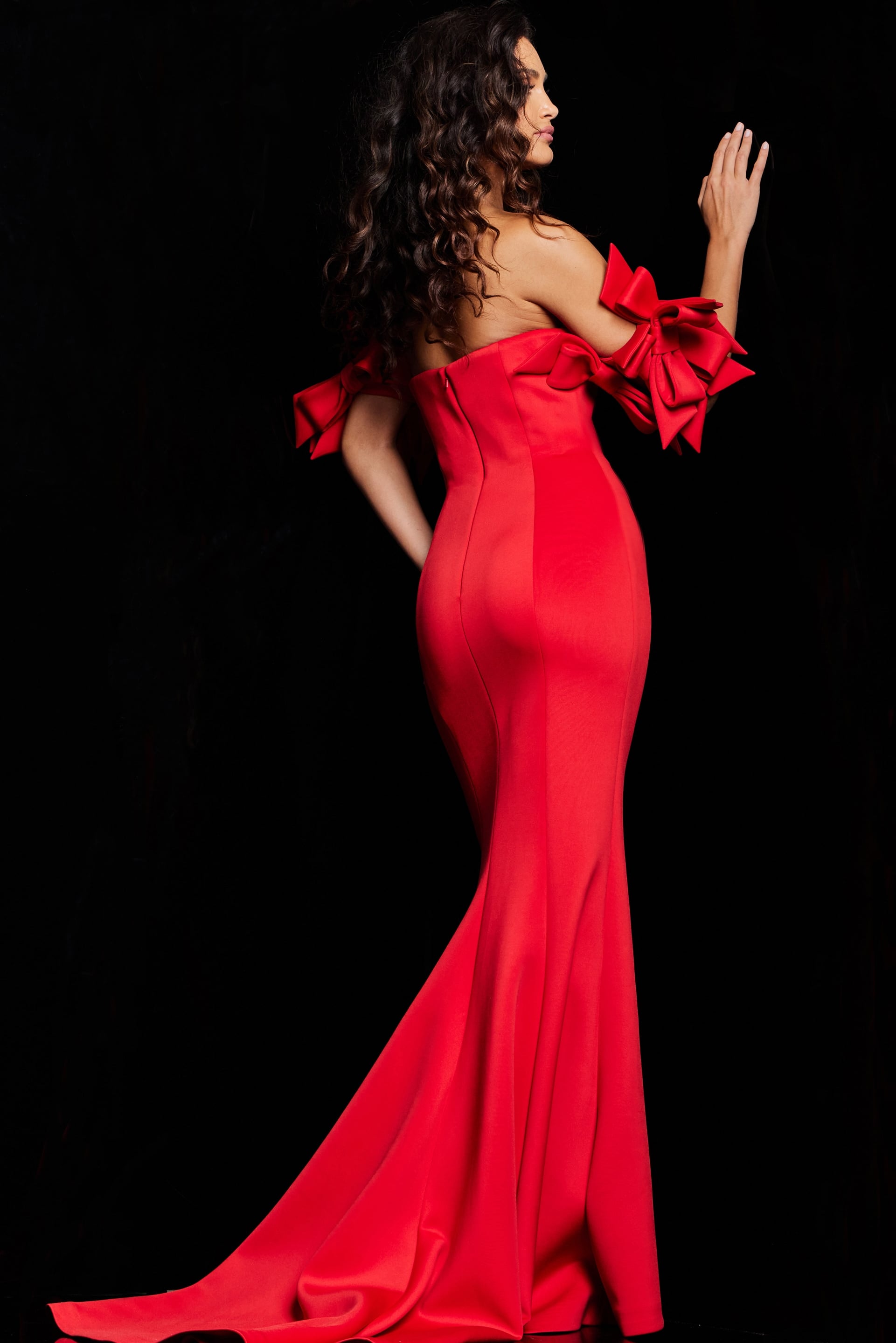 The off-the-shoulder-straight neckline frames the shoulders beautifully, adding a hint of allure and sophistication. The bow straps enhance the gown's femininity, adding a charming touch to the ensemble.