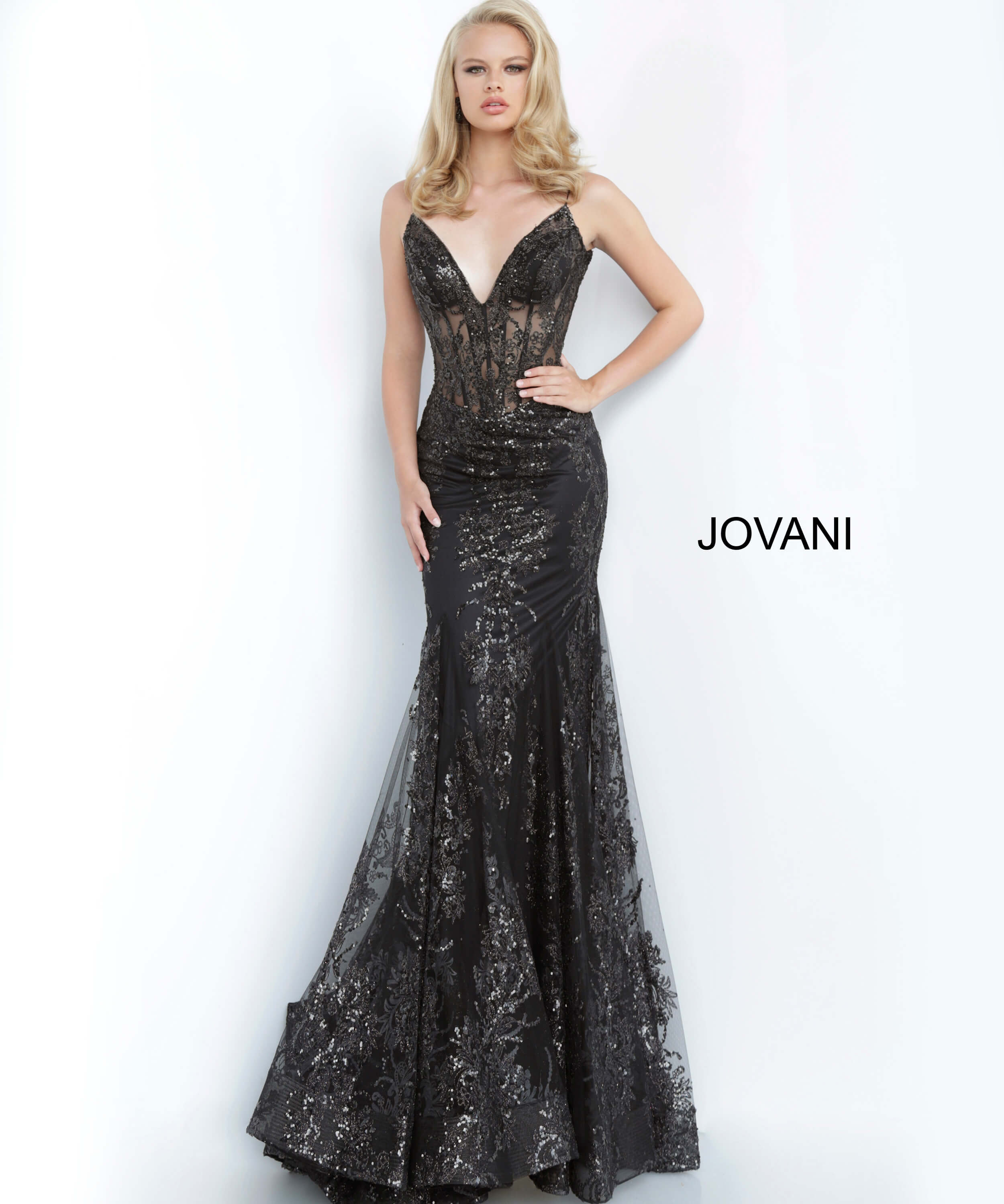 Experience the ultimate elegance and glamour with the breathtaking Jovani 3675 prom dress. Designed to make you feel like a true star on your special night, this dress features a form-fitting silhouette with a floor-length slight flare bottom and a sheer bodice with boning accentuating your curves. The plunging neckline, spaghetti straps over the shoulders, and V-back add a touch of drama, while the invisible back zipper with hook and eye closure ensures a seamless look.