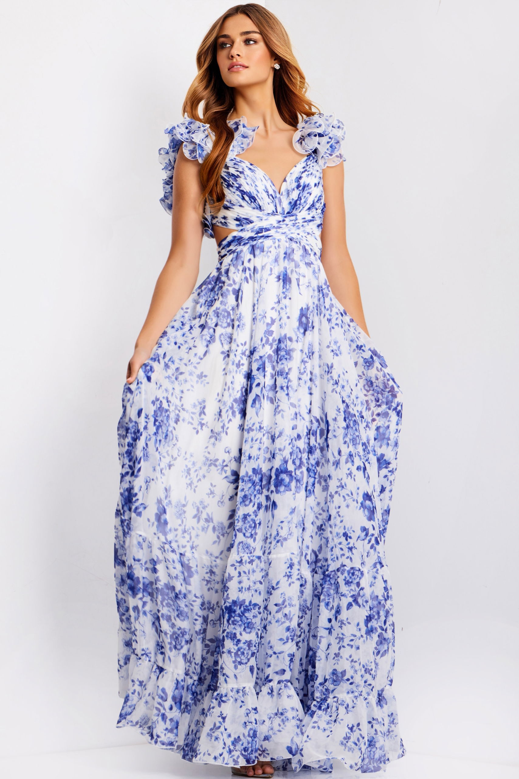 Ruffle Shoulder Floral A Line Gown With Cutouts 49143